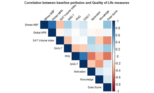 Figure 2. Baseline Pearson correlation matrix (ρ). EAT volume index), QOL/psychosocial scores (SAQ-7, PHQ-9, GAD-7, Motivation, Knowledge, Duke Activity), and CMR perfusion (Stress MBF, Global MPR) in women with ANOCA