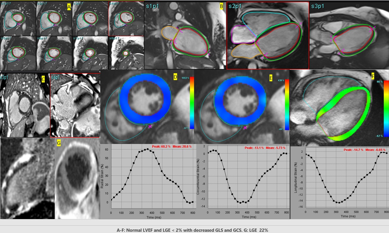 LVAD= left ventricular assist device, HFH= heart failure hospitalization, VT= ventricular tachycardia, VF= ventricular fibrillation, LVEF= left ventricular ejection fraction, LGE= late gadolinium enhancement, LV= left ventricle, LAX= long axis, SAX= short axis, ref= reference level. Figure 1: A-F: Decreased global longitudinal (GLS) and circumferential strain (GCS) with normal LV ejection fraction and LGE < 2% of LV mass. G: Marked LGE of 22% of the LV mass. *A: Short axis segmentations for left ventricle (LV) endocardial and epicardial borders from base, mid to apical segments. B: Long axis segmentation for LV showing mitral valve annular plane (X) and the apex (X) with endocardial and epicardial borders. C: Phase-Sensitive Inversion Recovery showing late gadolinium enhancement (LGE) involving basal inferior and inferior-lateral wall in different planes. D: LV short axis normal radial strain E: LV short axis decreased circumferential strain (Peak strain -13.1%) F: LV long axis decreased peak strain -14.7%. .jpg)