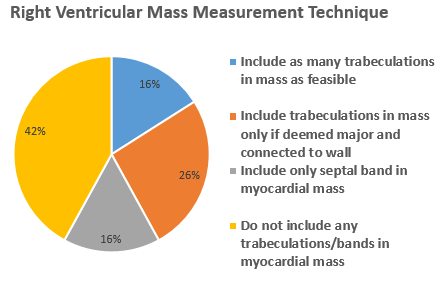 All centers use short-axis imaging for left ventricular (LV) measurements; 80% include papillary muscles in the blood pool. Most (84%) use short-axis for right ventricular (RV) volumes, with axial and 4-chamber views also used. Half do not routinely measure RV mass. Among those who do, 42% exclude trabeculations/bands and 26% include only major ones connected to a wall (Fig. 1)