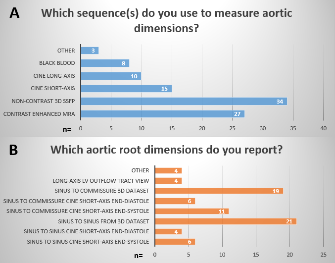 Aortic measurements are most often made from non-contrast 3D SSFP (77%) and contrast MRA (61%). Other sequences include cine short-axis, cine long-axis, and black-blood (Fig. 2A). Measurements are performed in diastole (52%), systole (43%), or ungated MRA (25%), with double-oblique cross-sectional views used by 89%.