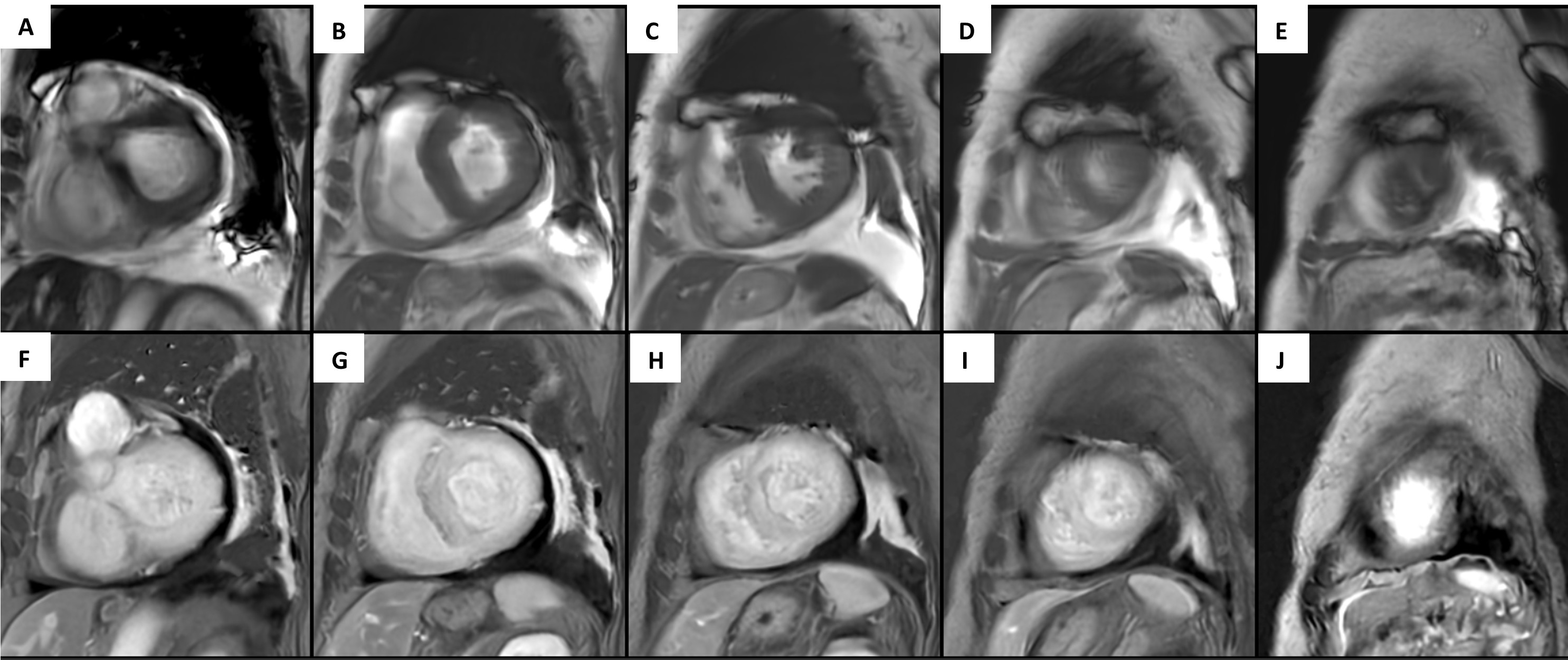 Fig 2. SSFP cine short axis images in end diastole demonstrating significant LV hypertrophy of the (A) (B) LV base, (C) LV mid cavity, and (D) (E) LV apex. The second row of images demonstrate short axis views with the presence of diffuse late gadolinium in the (F) (G) LV base, (H) LV mid cavity, and (I) (J) LV apex.