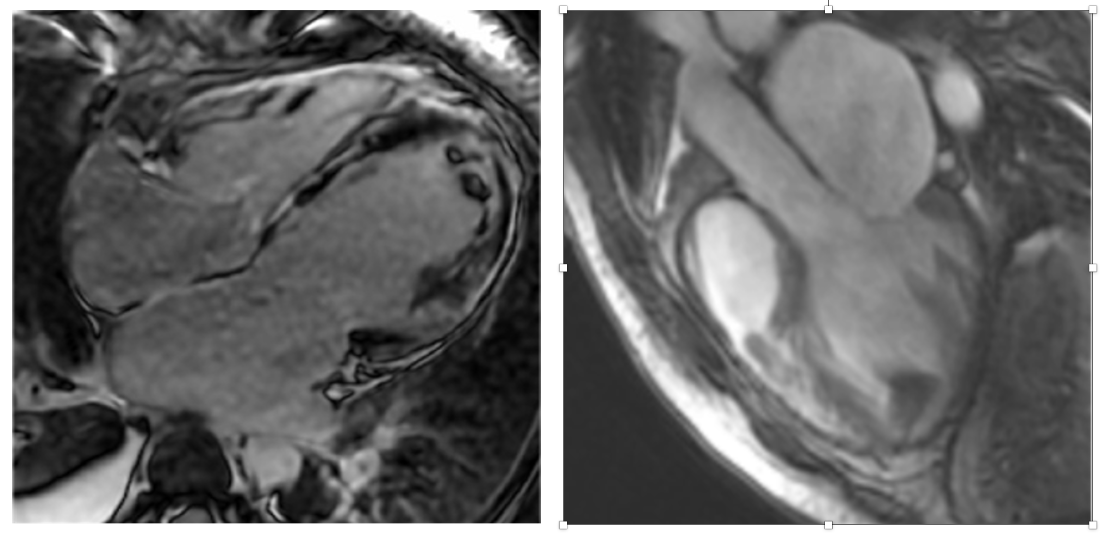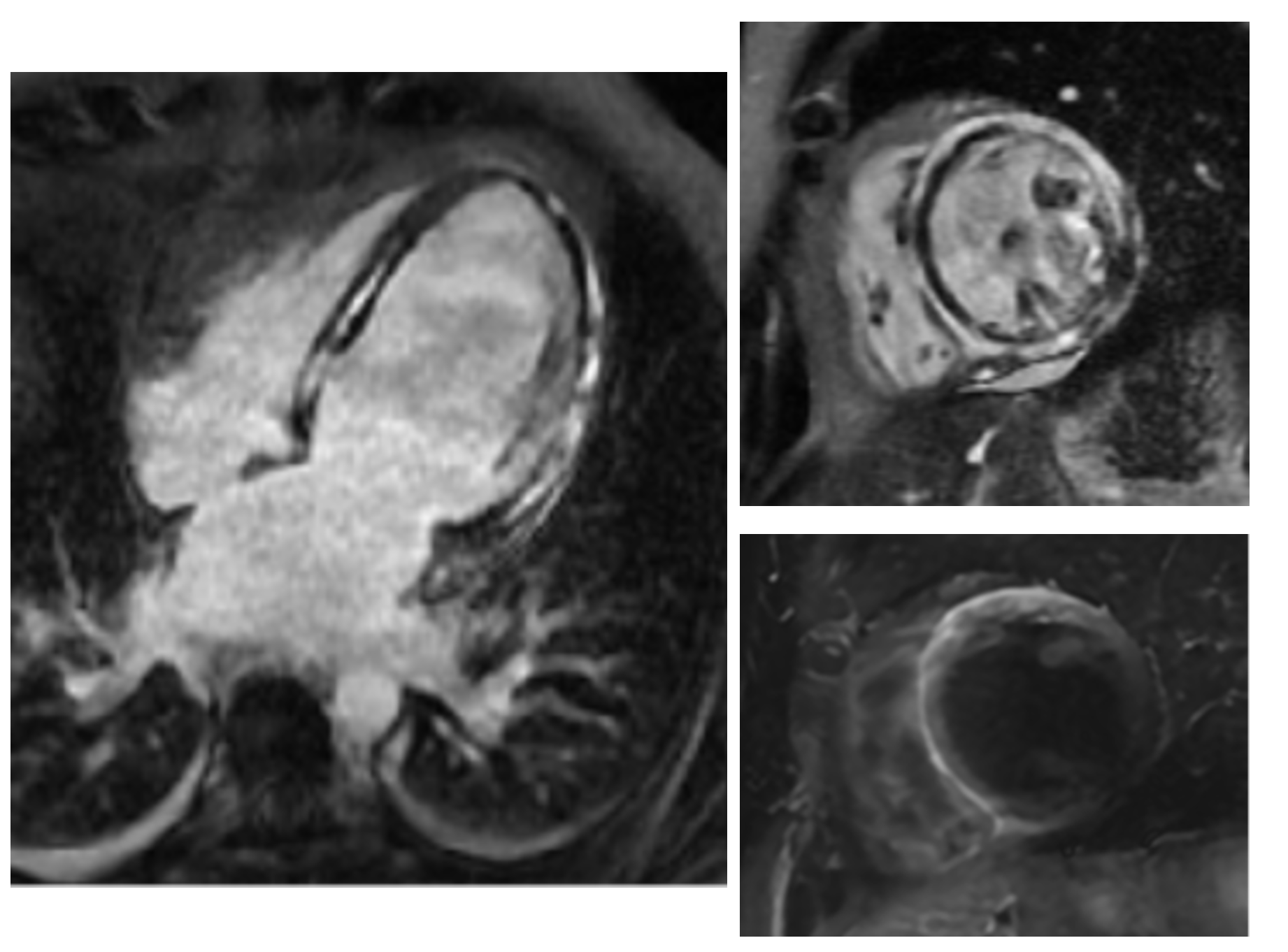 Second CMR: 4 Chamber view with LGE and 3 Chamber view showing both LV and RV thrombi