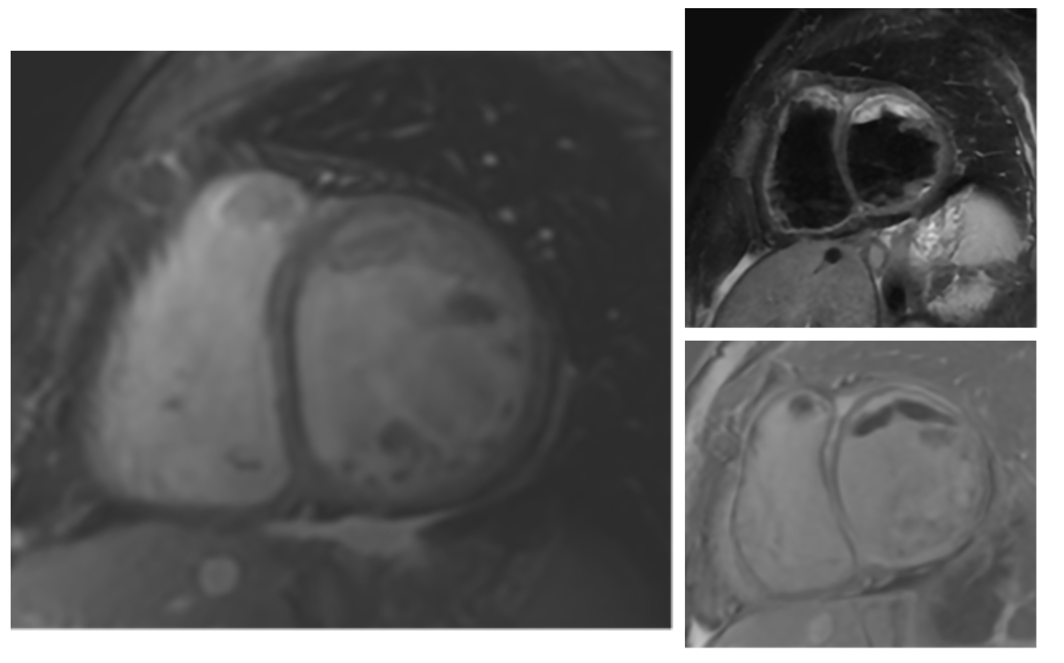 Second CMR SAX view showing LV and RV thrombi, with T2 image with corersponding edema