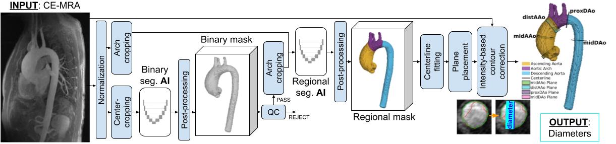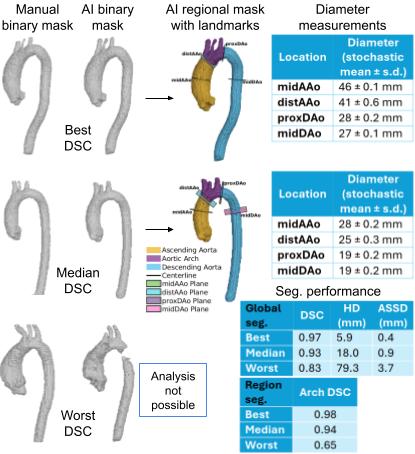 Figure 2: Segmentation results (ranked by Dice similarity coefficient [DSC]), with indicative analysis plane placement and diameter values. Analysis was completed for the first (best-DSC) and second (median-DSC) cases. The worst-DSC case failed quality control. Regional segmentation results are presented in terms of the arch region.