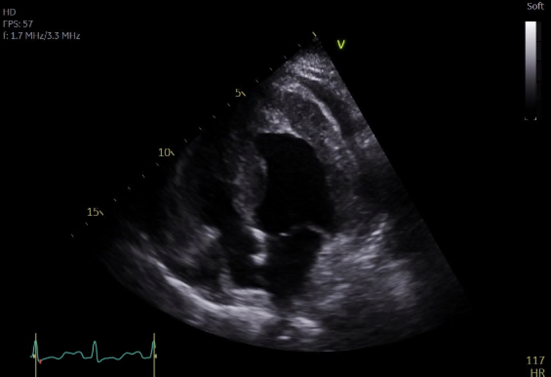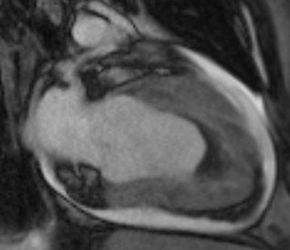Figure 2; Two Chamber Post Contrast Cine Image Demonstrating Obliteration Of The LV Apex With Thrombus Formation