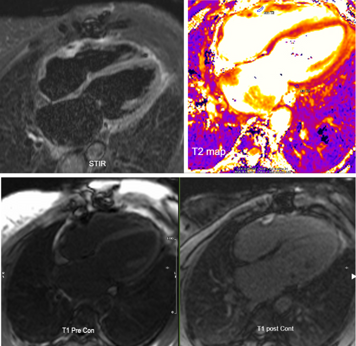 This picture is a collective of the CMR findings of the RCA perivascular inflammation, as shown to have high signal in the STIR and T2 map, suppression on T1 sequence enhancement in the T2 post contrast