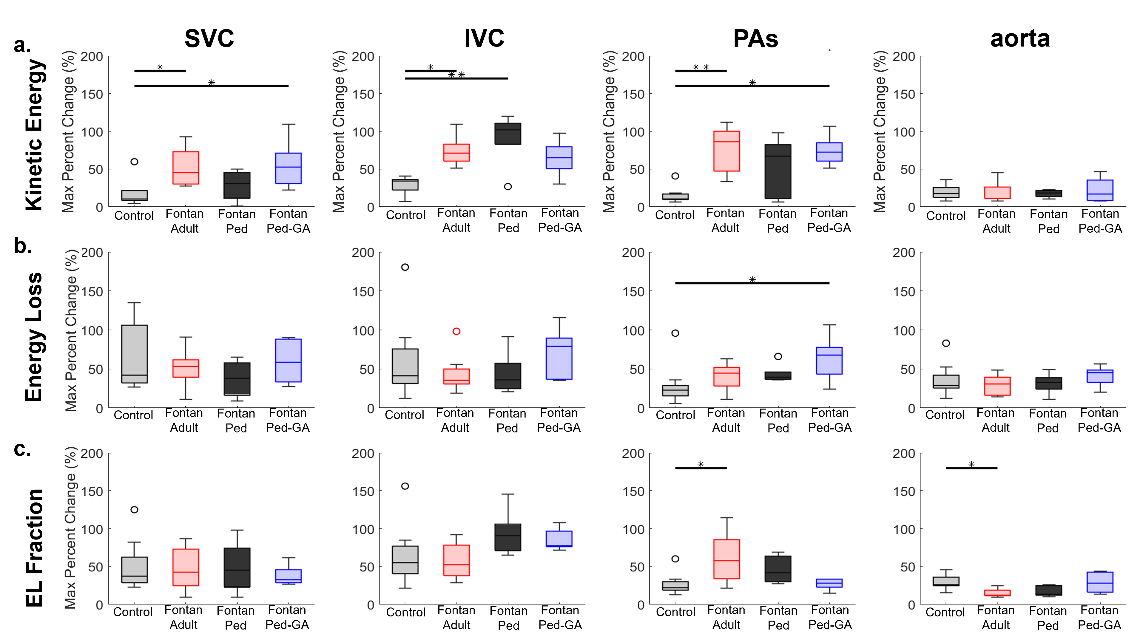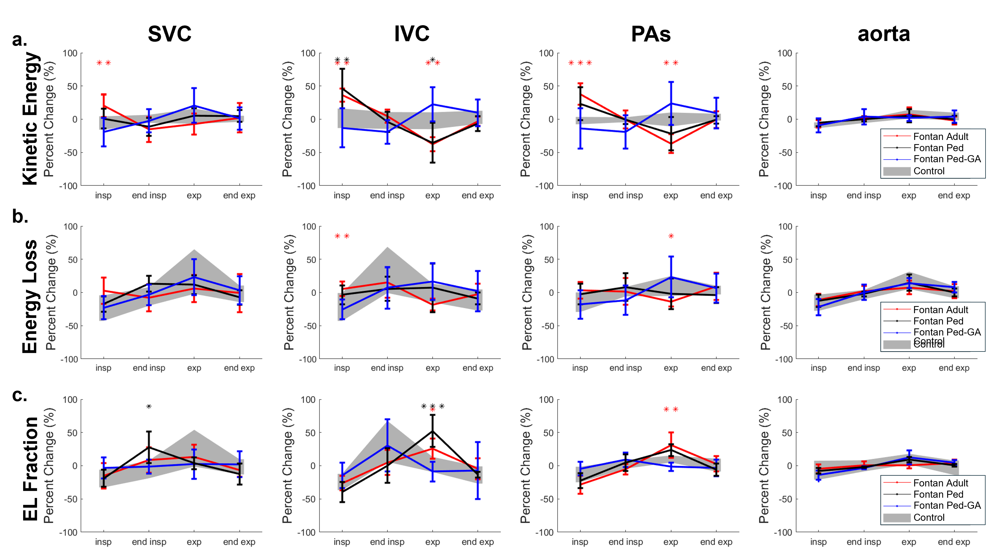 Figure 2: Respiratory variability in KE, EL, and EL/KE, computed as the 100%*(max-min)/mean. a) KE: Fontan Adults (red) had increased respiratory variability in SVC (50%, p<0.05), IVC (74%, p<0.05), and PA KE (74%, p<0.01) compared to controls (gray, 15-29%). Fontan Peds (black) had increased respiratory variability in IVC KE (92%, p<0.01) compared to controls. Fontan Peds-GA (blue) had increased respiratory variability in SVC (55%, p<0.05) and PA KE (74%, p<0.05) compared to controls. b) EL: Fontan Peds-GA had increased respiratory variability in PA EL (63%, p<0.05) compared to controls (29%). c) EL/KE: Fontan Adults had increased respiratory variability in PA EL/KE (61% p<0.05) and decreased in aorta EL/KE (15% p<0.05) compared to controls (27-29%).