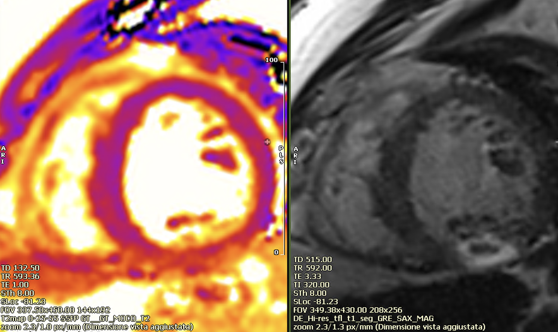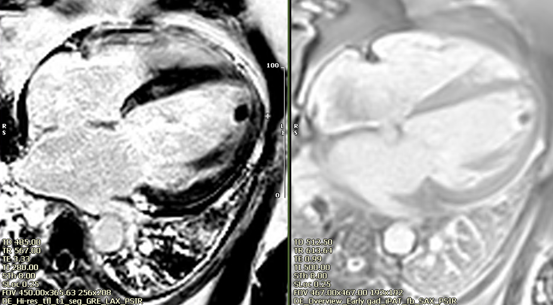 Non ischemic late enhancement (left panel), apical thrombus in early gad sequences (right panel).