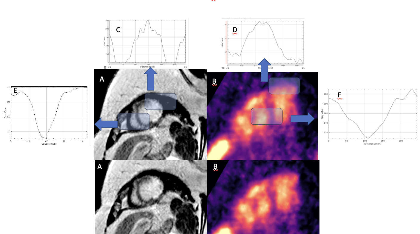 (A) Late gadolinium enhancement sequence at 1.5T showing transmural fibrosis in the lateral wall. (B) Sodium distribution map acquired at 7T, demonstrating focal 23Na accumulation in the corresponding region. (C) Signal intensity curve from the fibrotic area, illustrating increased gadolinium uptake. (D) Reproduced pattern of sodium accumulation in the same region, with concordant hyperintense signal. (E) Signal curve from normal septal myocardium, representing reference tissue pattern. (F) Sodium distribution in the septal region, showing a consistent normal pattern, similar to that observed in conventional tissue characterization..png)