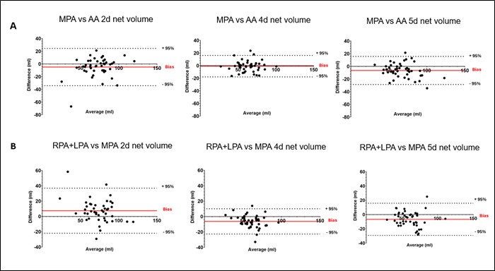 Abbreviations: AA = ascending aorta, DA = descending aorta, MPA = main pulmonary artery, RPA = right pulmonary artery, LPA = left pulmonary artery, SVC = superior vena cavaFigure 1: Bland-Altman analyses for comparison of internal consistency (Patients w/o shunt or Fontan physiology), net volume. P-values refer to ANOVA with Tukey post-hoc analyses for comparison of bias between the three sequences. MPA vs AA: 2D vs 4D vs 5D: p=0.079; 2D vs 4D p=0.283; 2D vs 5D p= 0.785; 4D vs 5D p=0.064 RPA+LPA vs MPA: 2D vs 4D vs 5D, 2D vs 4D and 2D vs 5D: p= <0.001; 4D vs 5D: p=0.863 Abbreviations: see table 1