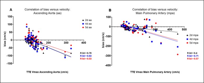 Figure 2: Correlation of bias (cm/s) vs velocity between TTE versus 2DPC, 4D and 5D flow CMR (all patients). Abbreviations: TTE = transthoracic echocardiography