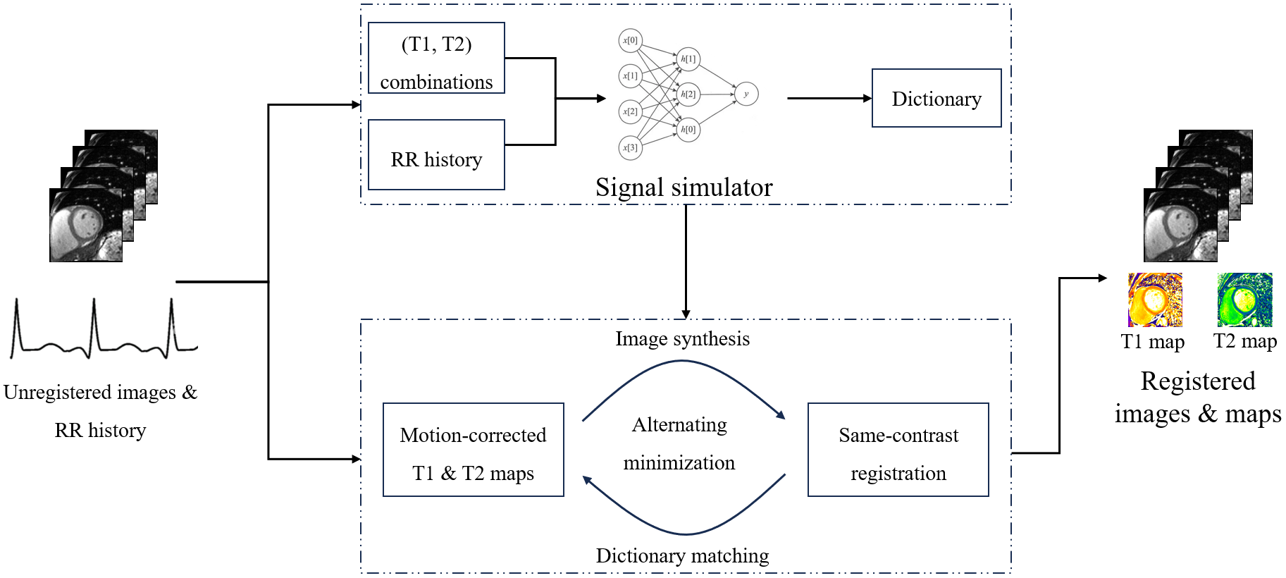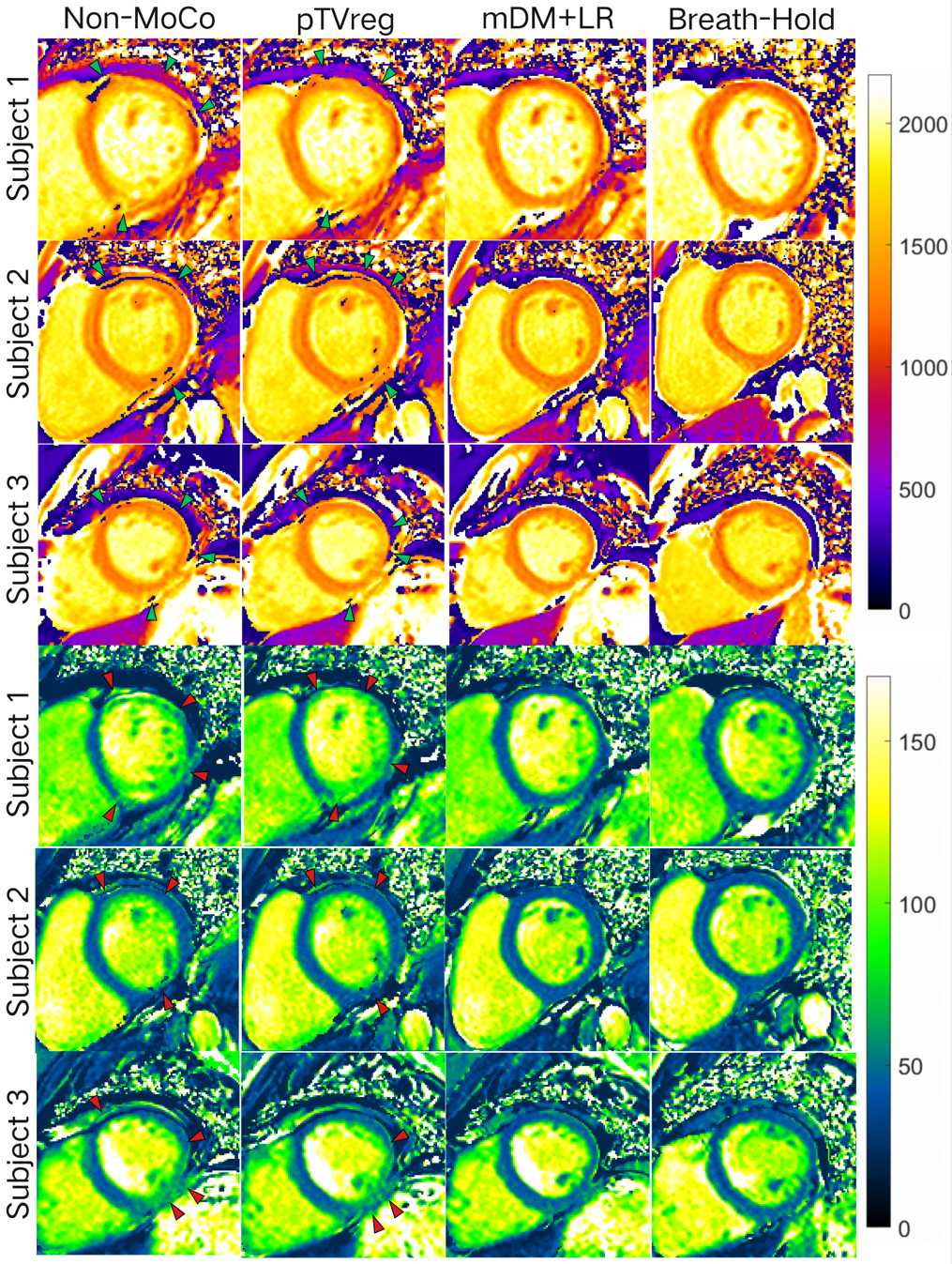 Figure 2. Comparison of T1 and T2 maps pre- and post-correction. The arrows indicate motion artifacts and blurs. mDM+LR better suppressed the motion-induced errors compared to non-MoCo and pTVreg, agreeing well with the breath-holding reference.