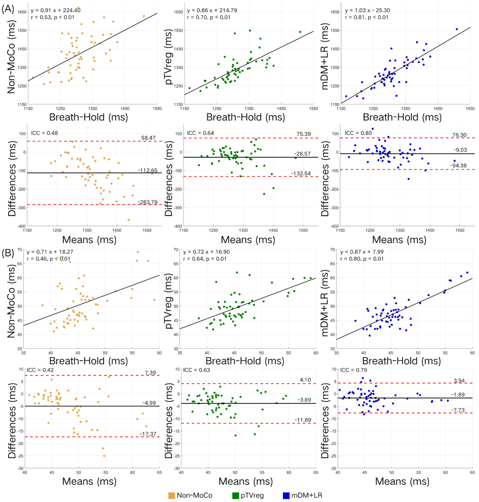 Figure 3. Correlation evaluation of myocardial (A) T1 and (B) T2 values against the breath-holding reference through linear regression and Bland-Altman analyses. The Bland-Altman plots depict the mean differences (black lines) and 95% limits of agreement (red lines). The fitted linear models, Pearson correlation coefficients (r), p-values, and Intraclass Correlation Coefficients (ICC) were labeled. mDM+LR achieved stronger T1/T2 correlation relative to the breath-holding reference than non-MoCo and pTVreg..png)