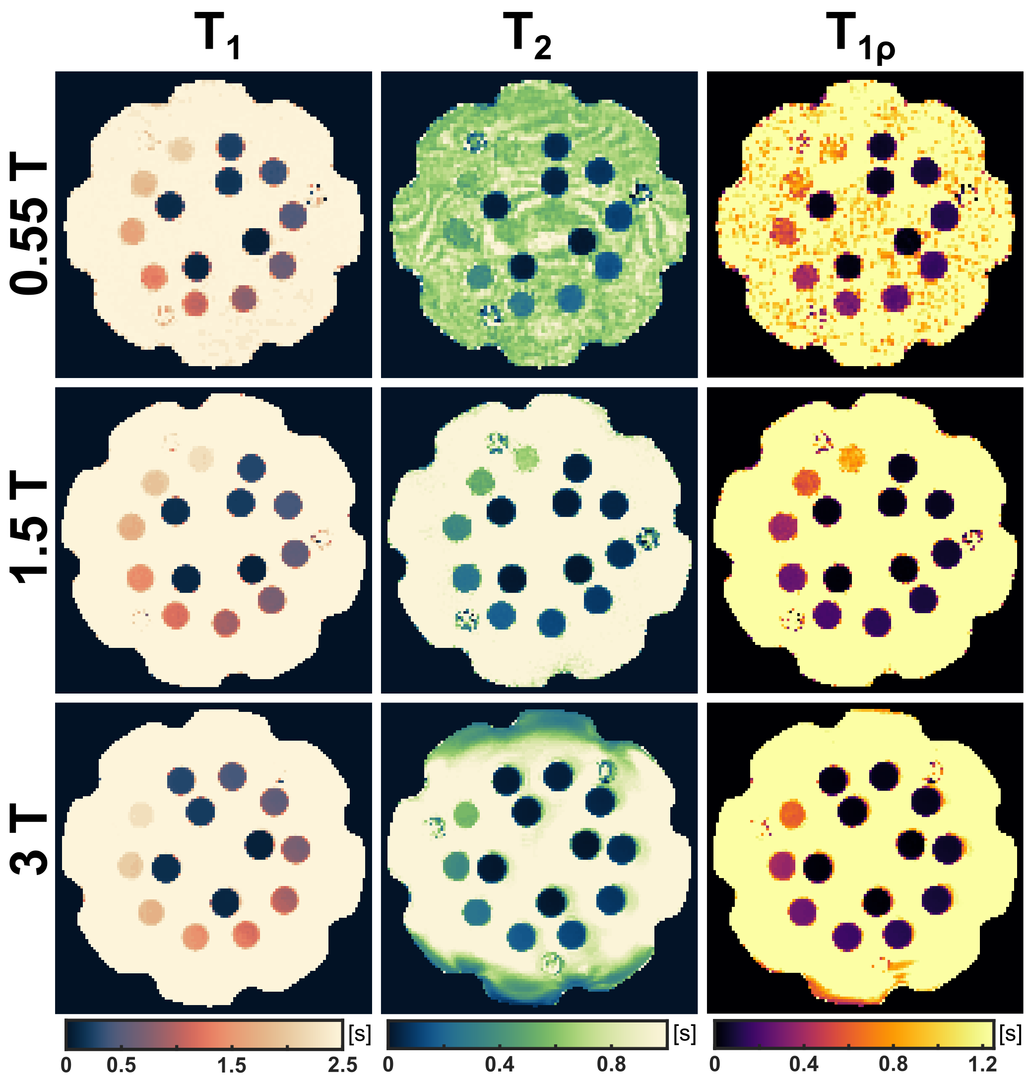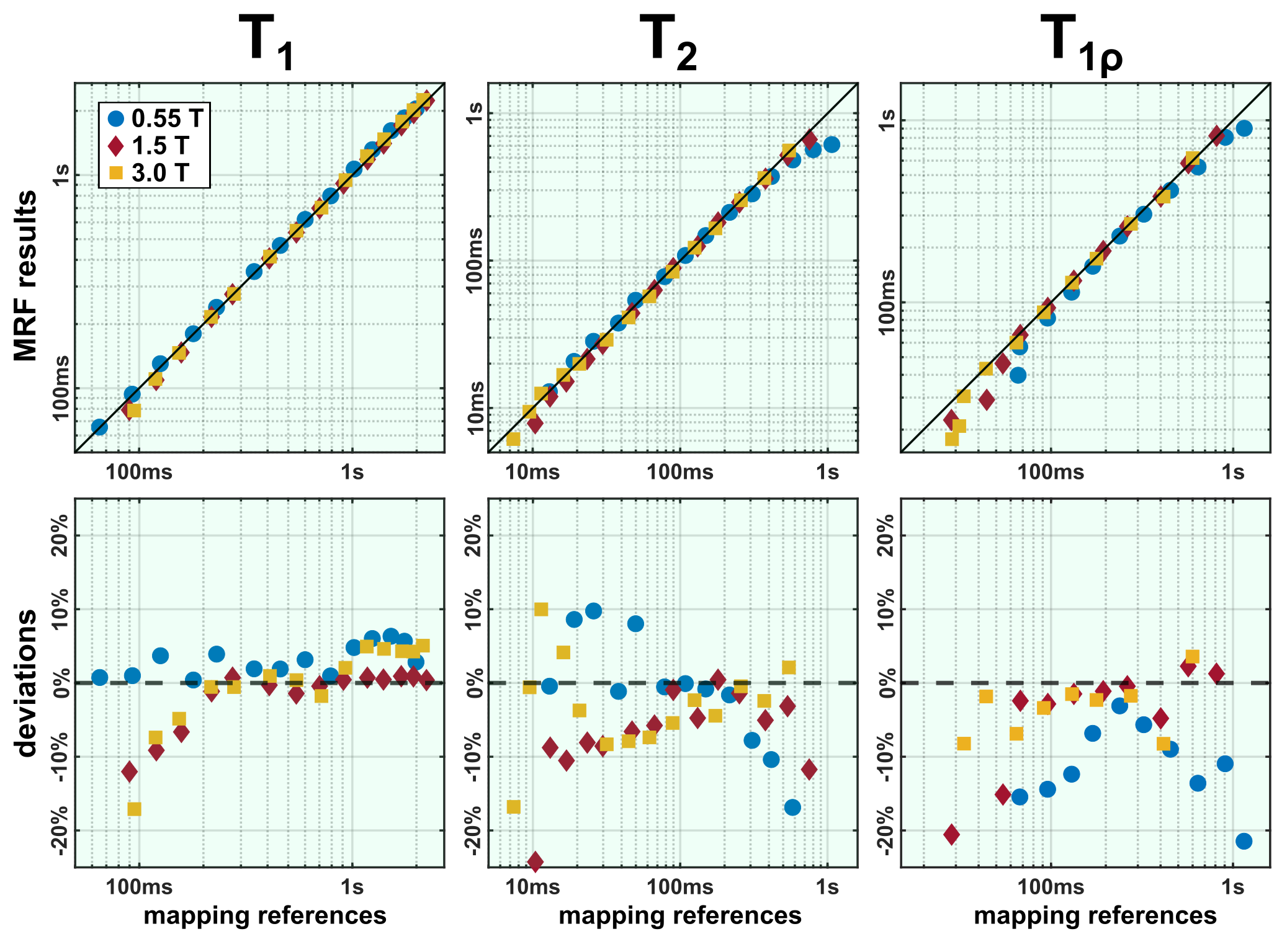 Figure 2) Deviation of T1, T2, and T1ρ values from gold-standard reference sequences. Across all parameters and field strengths, high agreement was observed. Only very short or very long relaxation times, which are of limited physiological relevance, showed increased deviations.