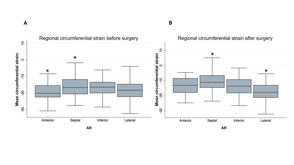Data are expressed as mean ± standard deviation for numerical variables and as absolute values and percentages for categorical variables. AR= aortic faliture ; AS= aortic stenosis; SAH= Systemic Arterial Hypertension; CAD= Coronary Artery Disease; ACEI= Angiotensin-Converting Enzyme inhibitor ;ARB= Angiotensin Receptor Blocker;Figure 1: (A–B) Representation of regional circumferential strain obtained by cardiovascular magnetic resonance before (A) and after (B) surgical correction in patients with aortic regurgitation. (A) A heterogeneous contractility pattern is observed, with significantly greater strain in the septal segment compared to the anterior one, with the septum being the least contractile segment (p = 0.0001). (B) After surgery, regional heterogeneity becomes more pronounced, with emphasis on the difference between the septal and lateral segments (p = 0.0001). A more marked worsening in the septum and relative preservation of the lateral segment compared to the preoperative exam is also noted.