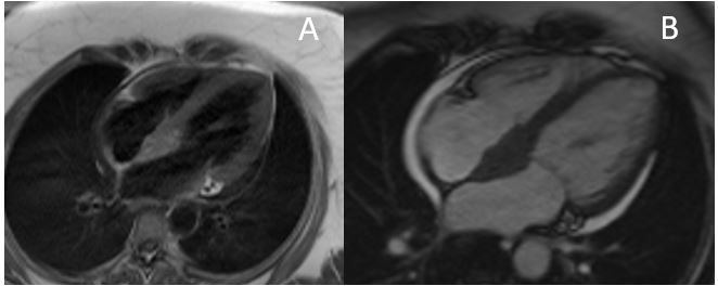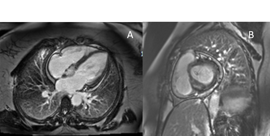 Figure 3: Four chamber (A) and Short Axis (B) late gadolinium enhancement