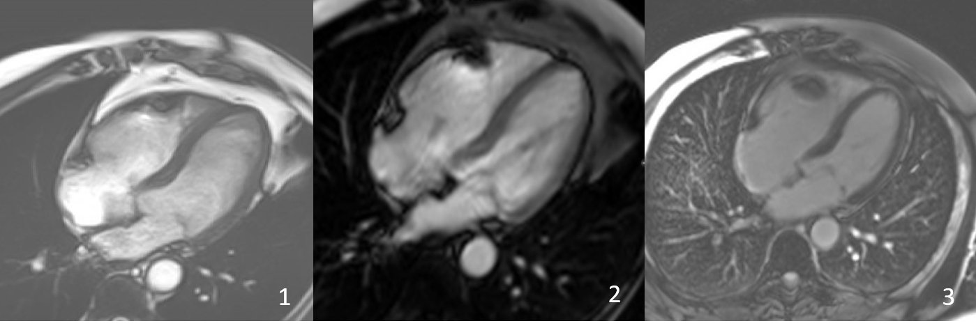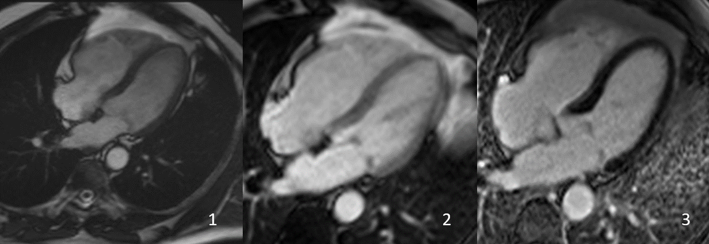 FIG 3- Follow up scan showing 4 Ch cine view in b-SSFP (1)- Early gadolinium enhancement (2) and late gadolinium enhancement (3) demonstrating no mass in the RV.