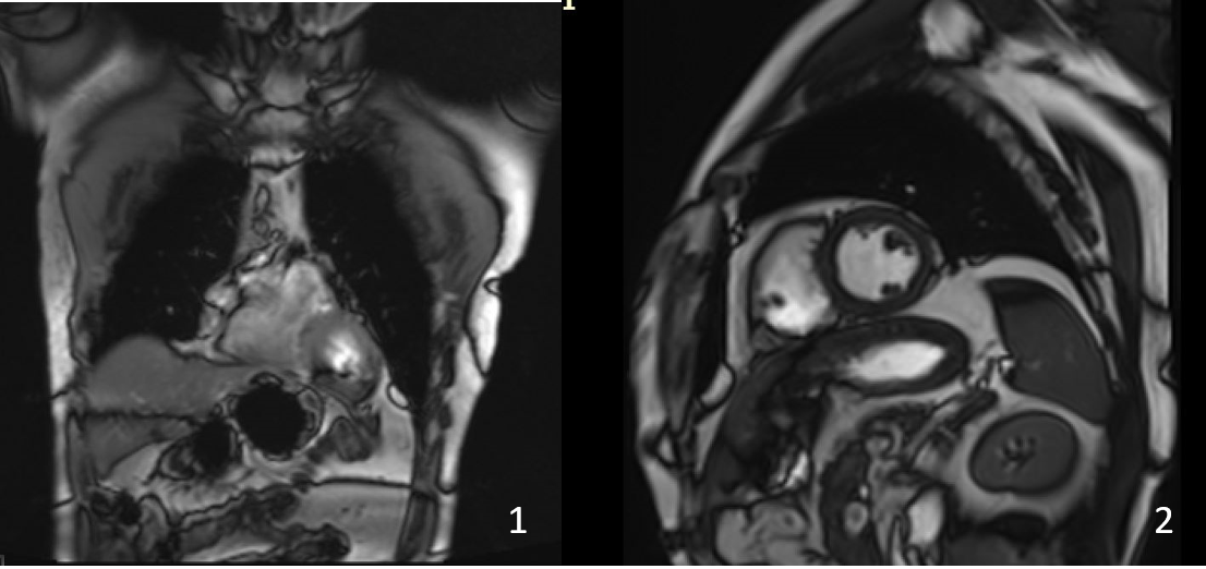 FIG 2- Localizer b-SSFP (1) and short Axis b-SSFP demonstrating the region of the artefact.