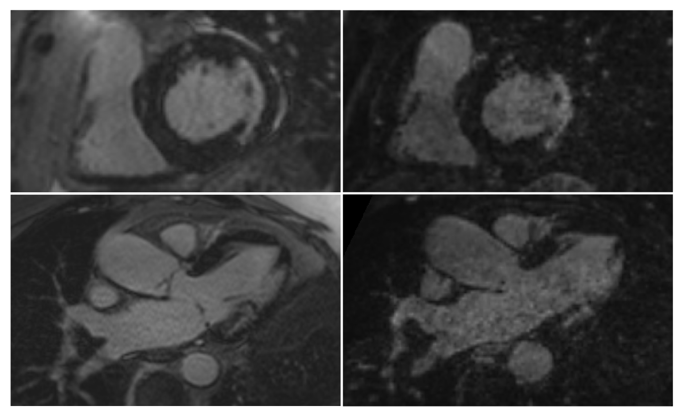 Figure 2: Images showing a comparison between the clinical (left) and proposed (right) scans. One clinical short axis slice and a short axis reformat of the proposed scan are shown top and a similar 3-chamber pair is shown bottom. Both scans show similar patterns of lateral subendocardial enhancement.