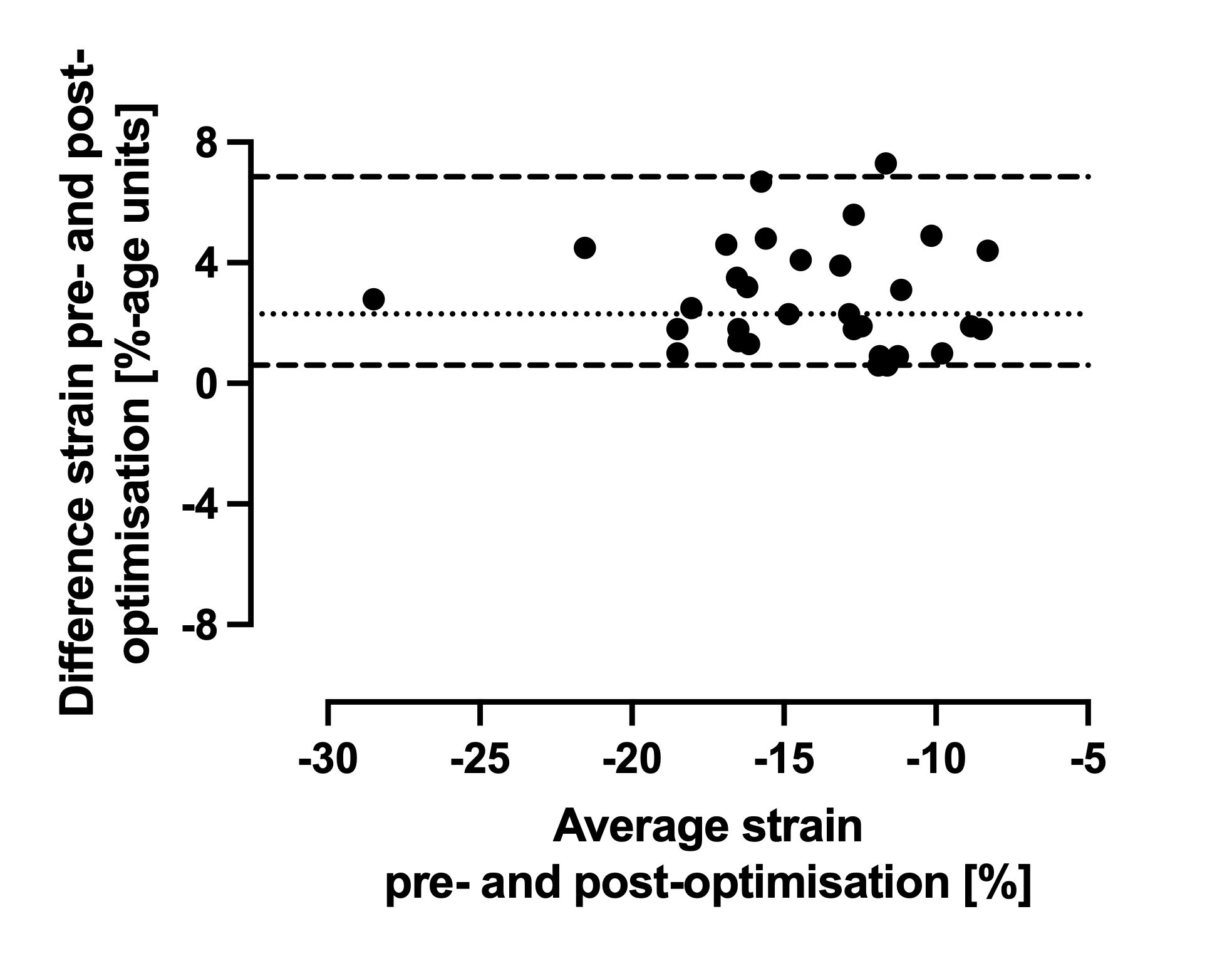 Figure 2. Bland-Altman plot showing the agreement between left ventricular strain values before and after optimisation. Before optimisation, left ventricular 4-chamber strain was -12 % [-10 to -15], which changed to -16 % [-12 to -18] after optimisation (p < 0.001), with bias 2.3 %-age units and 95 % limits of agreement 0.6–6.9 %-age units.