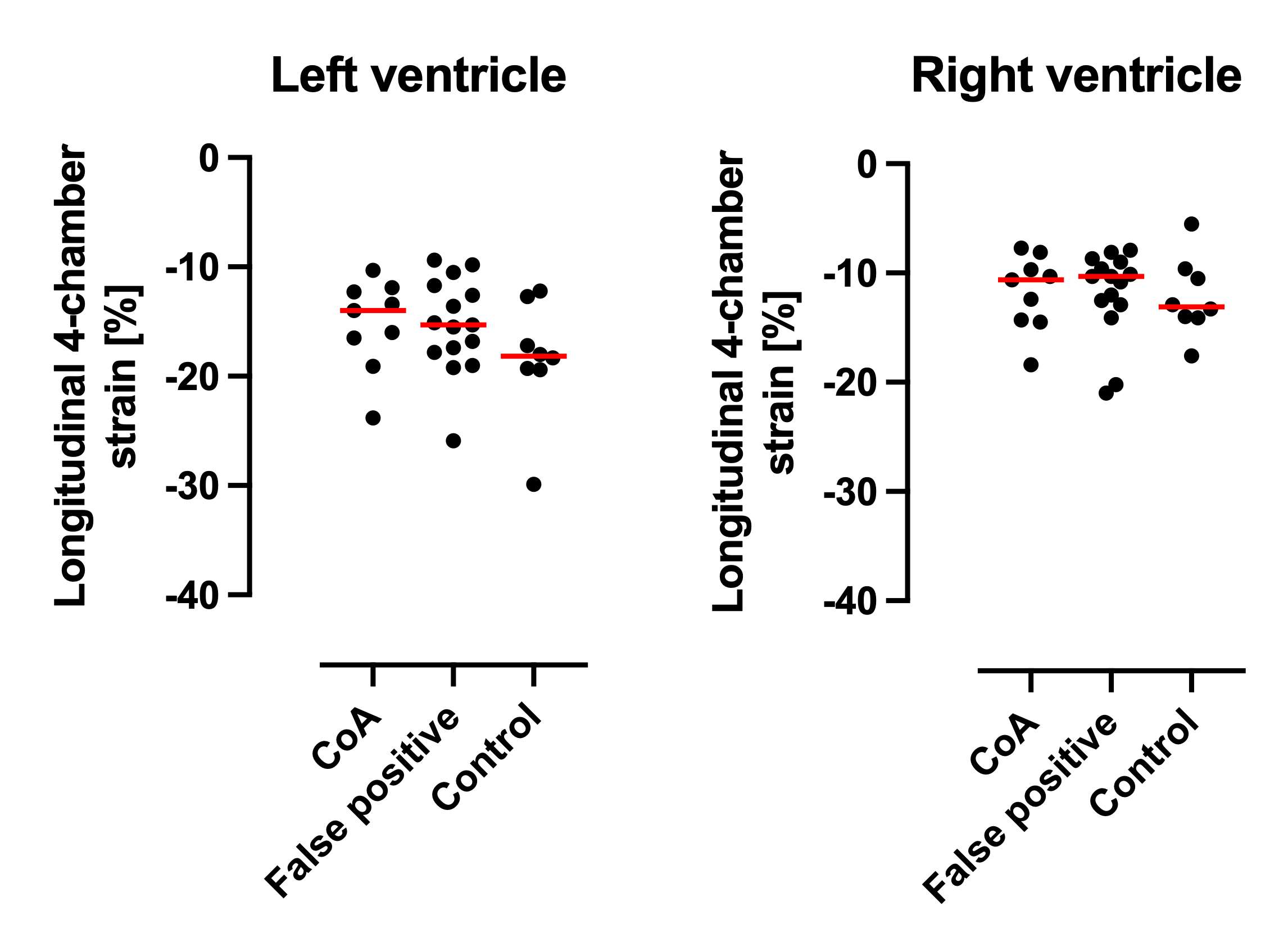 Figure 3. Longitudinal 4-chamber strain for the left and right ventricles in fetuses developing CoA, fetuses that were false positive, and in healthy controls. Although a visual tendency, trend analysis show that there is no trend of less negative left ventricular strain values in fetuses that developed CoA after birth compared to false-positive cases and controls (p=0.07).