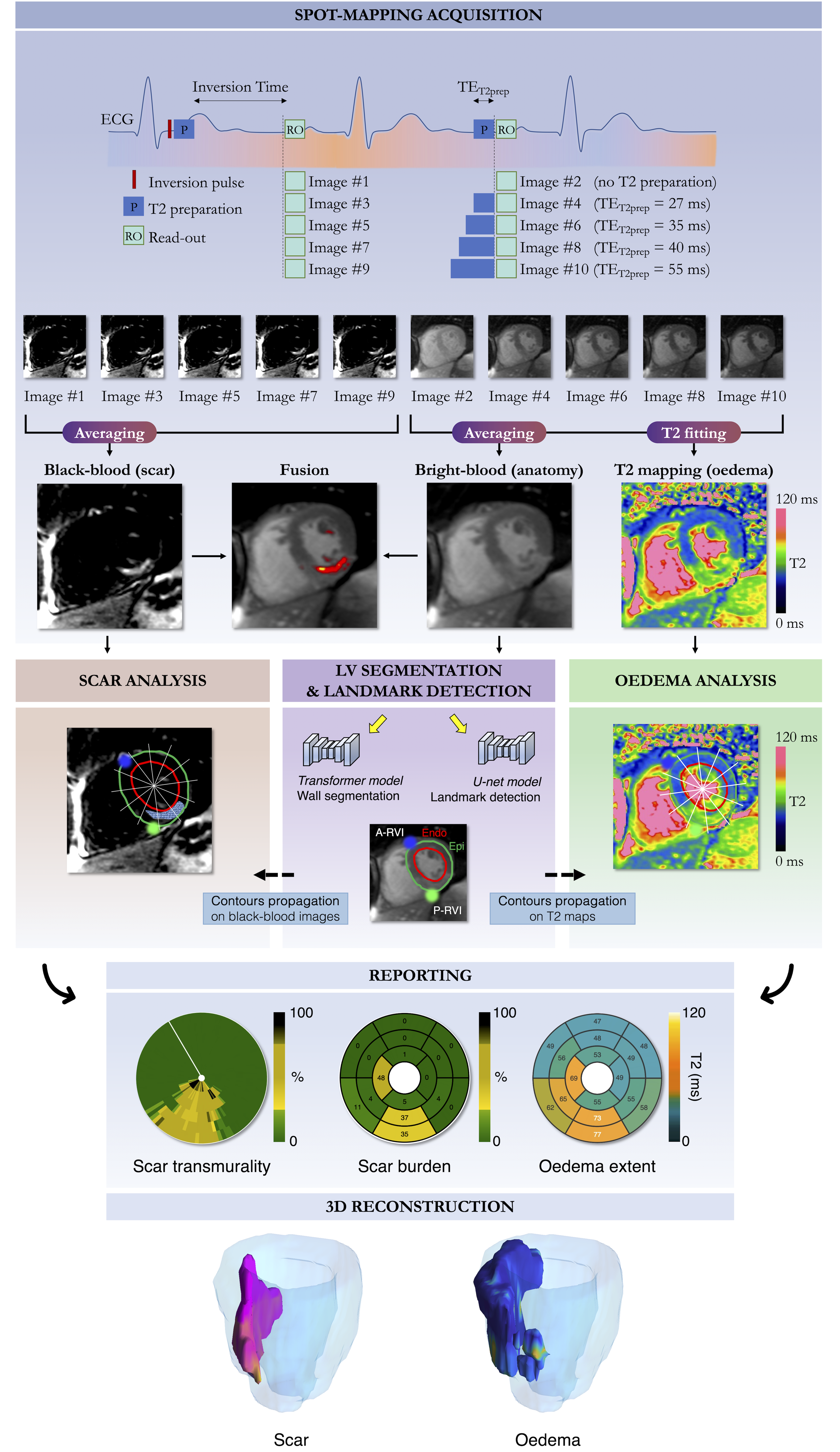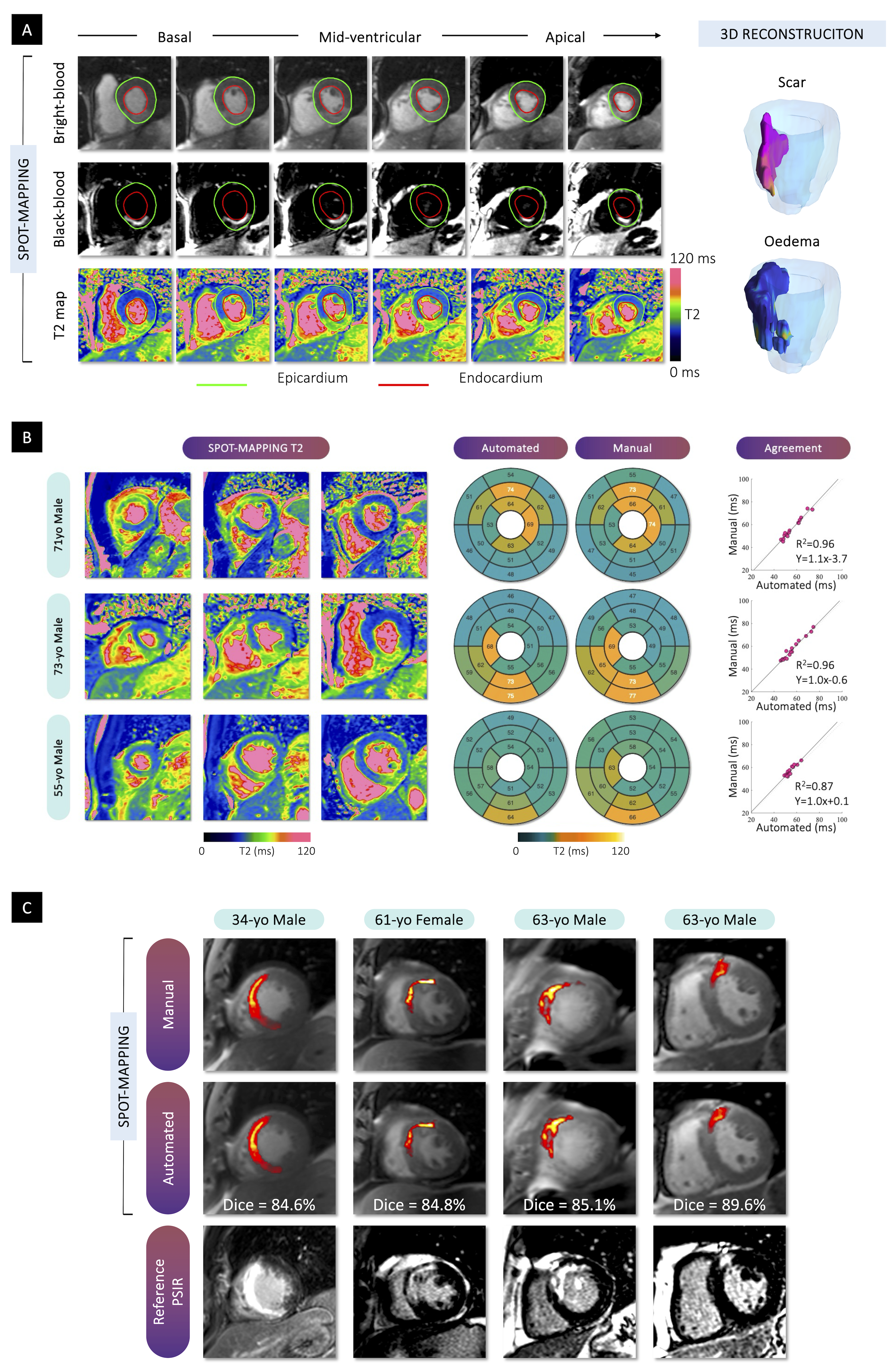 Representative examples of automated versus manual quantification of myocardial scar and oedema using SPOT-MAPPING. A) Representative basal, mid-ventricular, and apical slices from SPOT-MAPPING, including bright-blood, black-blood, and T2 maps, demonstrate regional detection of myocardial oedema and scar, with 3D reconstructions showing spatial distribution. B) Comparison of automated vs. manual segmental T2 quantification in multiple patients, with bullseye plots and scatter plots showing high correlation and agreement across T2 values. C) Scar segmentation overlays from SPOT-MAPPING (manual and automated) compared to PSIR reference images in multiple patients, with Dice coefficients demonstrating strong concordance between automated and manual methods.