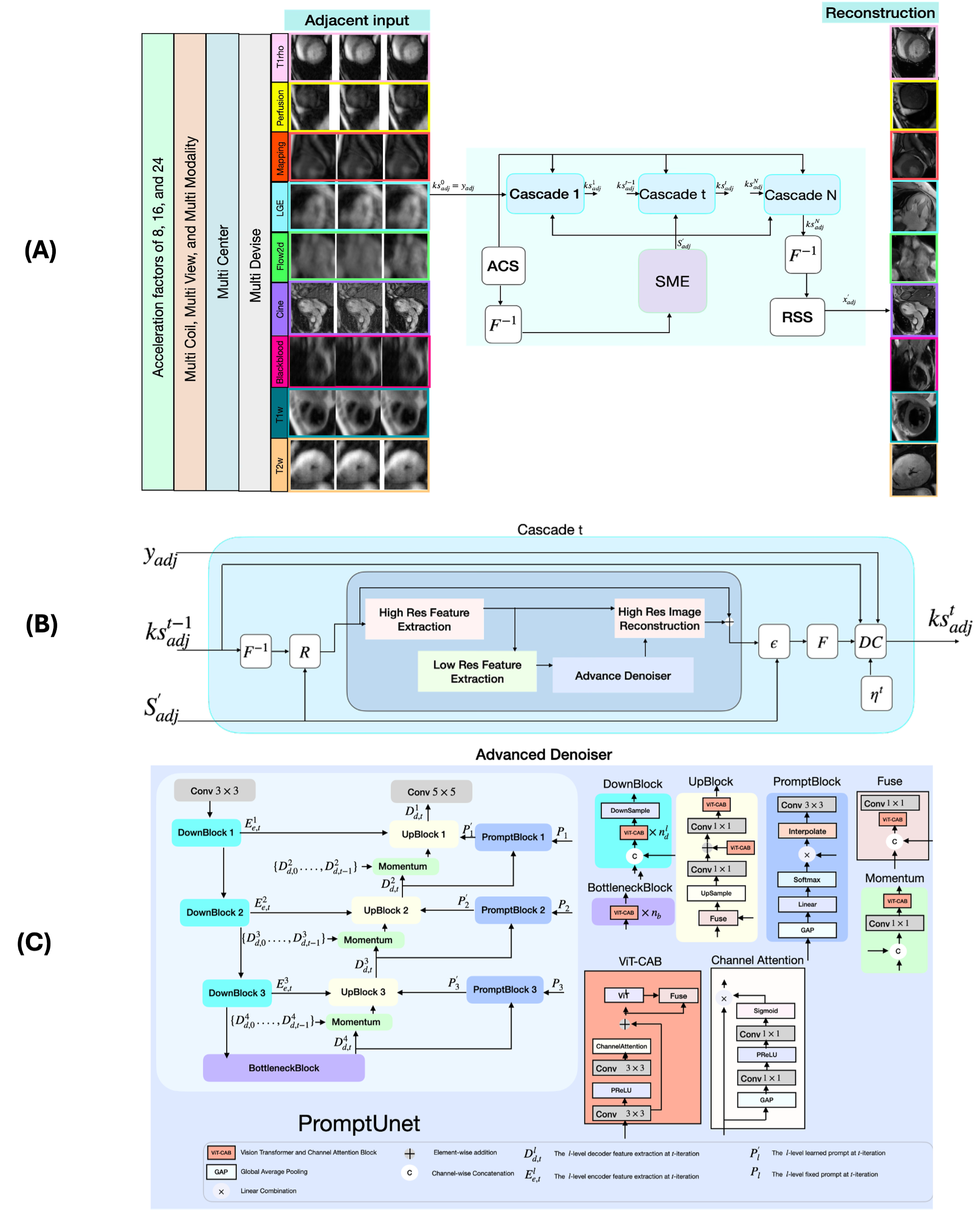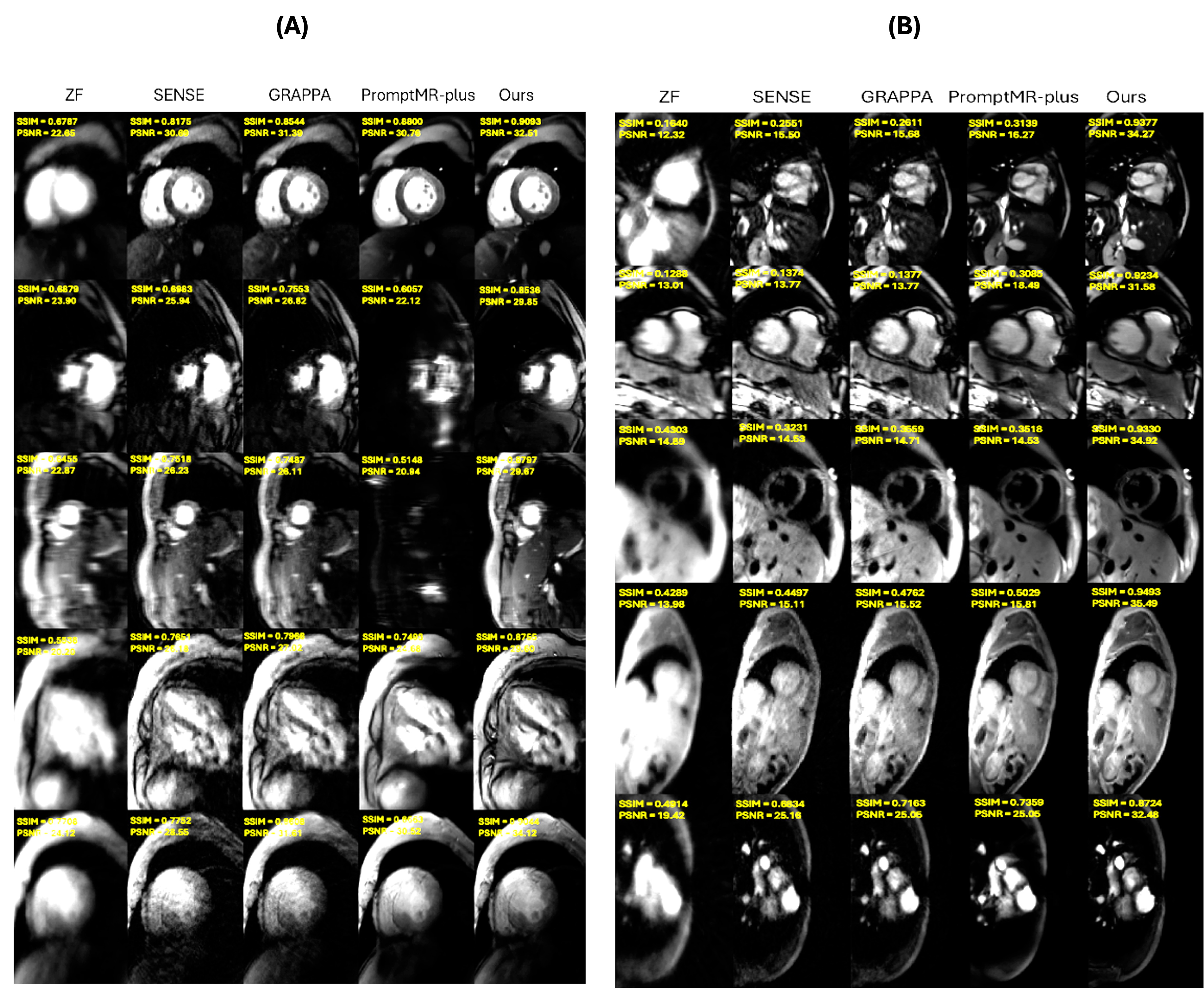 Figure 3: Qualitative comparison of cardiac MRI reconstruction methods across specialized applications. (A) Visual results for 5T high-field cardiac MRI reconstruction comparing Zero-Filled (ZF), SENSE, GRAPPA, PromptMR-plus, and our approach (Ours) across representative samples from TaskS1. (B) Visual results for pediatric cardiac MRI reconstruction using the same methods across representative samples from TaskS2. Each reconstructed image displays corresponding SSIM and PSNR values. Our approach consistently produces the clearest reconstructions with superior preservation of anatomical details and minimal artifacts across both challenging domains. Traditional methods (SENSE, GRAPPA) exhibit significant noise and blurring, while PromptMR-plus shows inconsistent performance with incomplete reconstruction in several cases. Our method demonstrates robust generalization capabilities, achieving the highest quantitative scores while maintaining excellent visual quality across diverse cardiac anatomies and imaging conditions without domain-specific training..png)