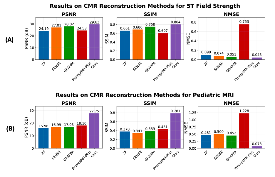 Figure 2: Performance comparison across reconstruction methods for specialized cardiac MRI applications. (A) Results for 5T high-field cardiac MRI reconstruction showing PSNR (left), SSIM (middle), and NMSE (right) metrics. (B) Results for pediatric cardiac MRI reconstruction with the same metric layout. Methods compared include Zero-Filled (ZF), SENSE, GRAPPA, PromptMR-Plus, and our proposed VTransFormer approach (Ours).