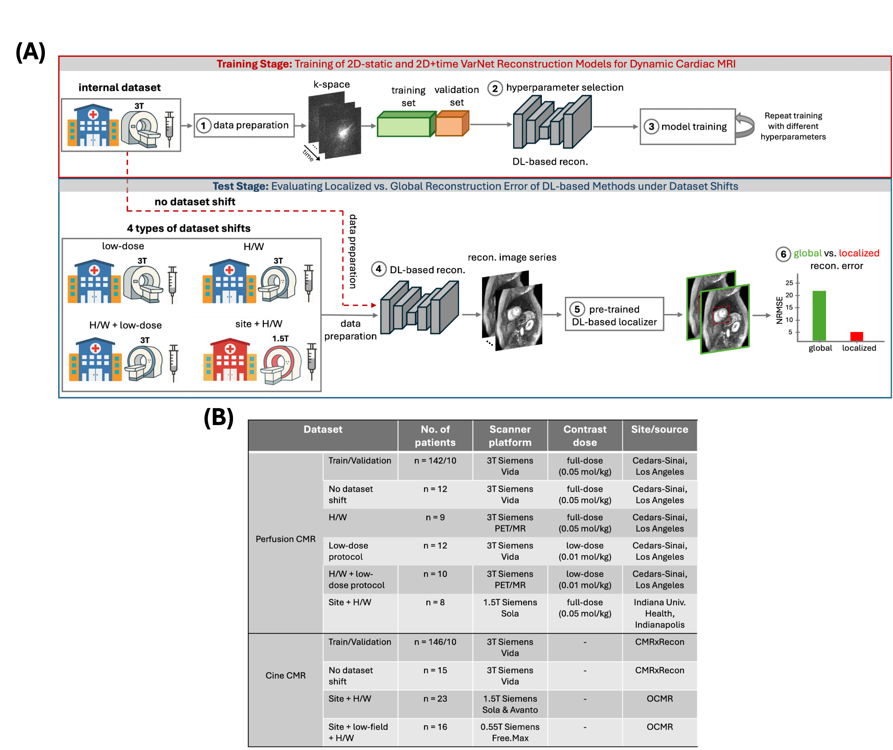 Figure 3: DL-based cardiac perfusion and cine reconstructions under different dataset shifts, illustrating that localized errors capture model generalization more effectively than global errors. Panels (A) and (B) show cumulative reconstruction results for perfusion and cine CMR at effective acceleration of 3.5 retrospectively, for two DL-based methods (2D-static and 2D+time VarNet), trained separately and evaluated on different test sets including “no dataset shift” case from Fig. 2B. Global NRMSE, computed over the entire image, shows little variation across test sets and statistically not significant (p>0.05). In contrast, localized NRMSE, computed within the cardiac region from the DL-based localizer, consistently separates the reconstruction error in different test sets and yields more statistically significant differences. This pattern is observed consistently across both DL models and both imaging modalities, demonstrating that localized NRMSE is more sensitive to dataset shifts than global NRMSE.