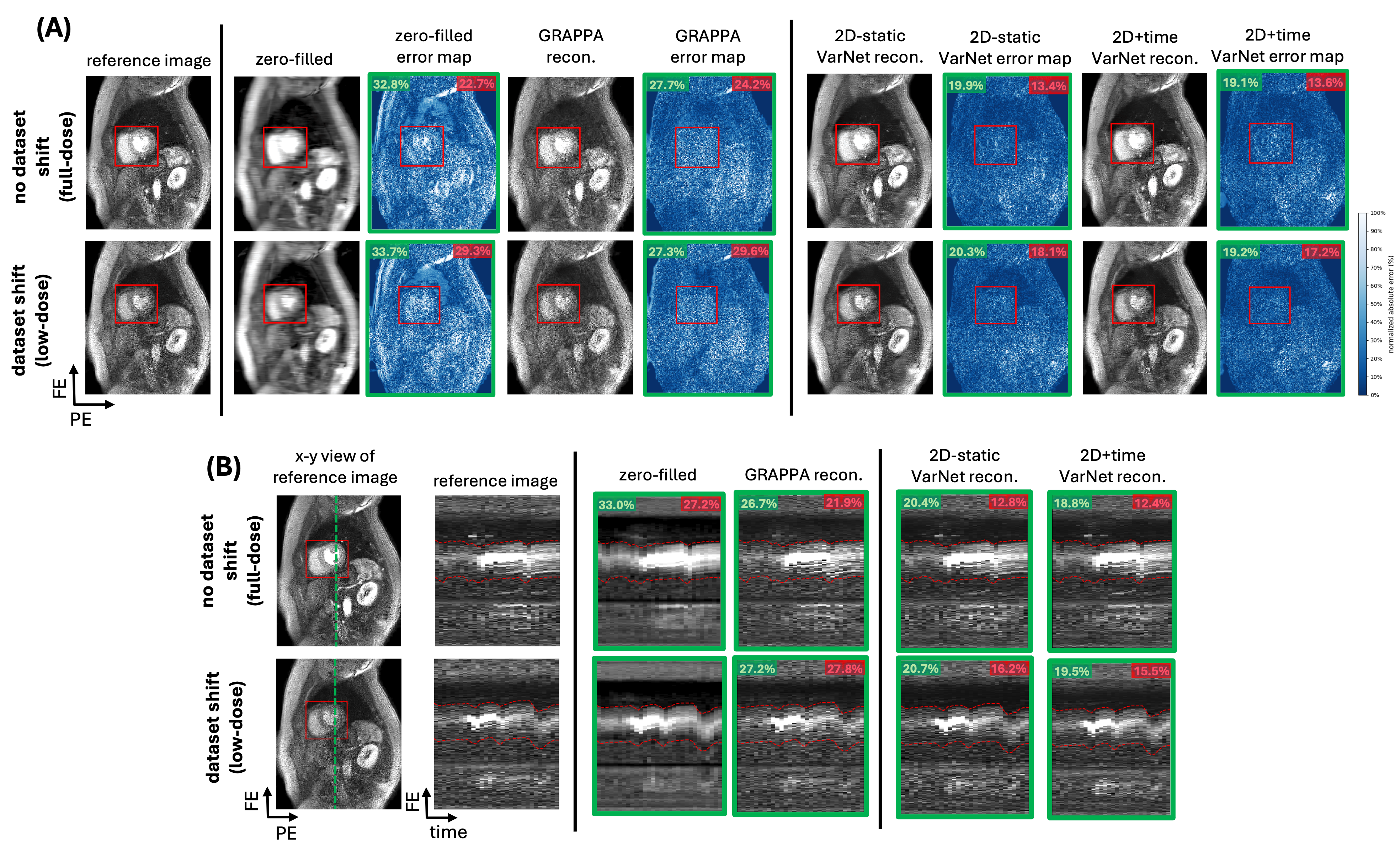 Figure 2: (A) Myocardial perfusion representative reconstruction results from two different scans of the same patient under no dataset shift and dataset shift due to a low-dose contrast protocol, highlighting the importance of using localized error metric to accurately assess the impact of dataset shift. From left to right, the first column shows the artifact-free scanner reconstruction, which is considered reference image. Subsequent columns display reconstructions from retrospectively subsampled data at effective acceleration rate of 3.5 using a Cartesian sampling with 10% calibration lines. These include a zero-filled reconstruction (inverse FFT with missing data set to zero), GRAPPA [5], and two DL-based methods (2D-static and 2D+time VarNet). Global (green) and localized (red) NRMSE values are shown at the top-left and top-right of each reconstruction. Under the low-dose protocol, global NRMSE increased by 0.4% for 2D-static and 0.1% for 2D+time reconstructions, while localized NRMSE increased by 4.7% and 3.6%, respectively. (B) Myocardial perfusion representative y-t cuts corresponding to the scans in (A). The first column shows the x-y view of the reference image with the cardiac region (red box) generated by a pre-trained localizer. Green dashed lines show the y-t cut location whereas red dashed lines follow the localization box on y-t cut over time. Global NRMSE was calculated over the full y–t cut, whereas localized NRMSE was calculated only within the segment of the y–t cut that falls inside the red box. Under the low-dose protocol dataset shift, global (green, top-left) NRMSE changed by 0.3% for 2D-static and 0.7% for 2D+time reconstructions, while localized NRMSE changed by 3.4% and 3.1%, respectively.