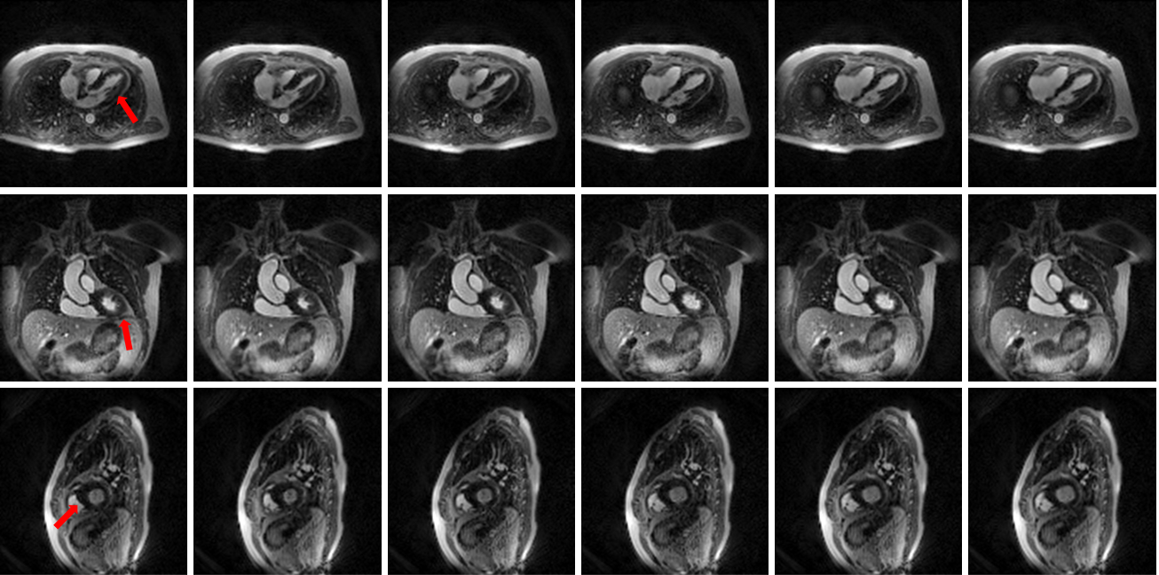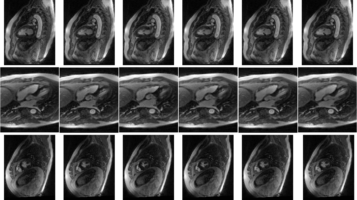 Figure 2. Reformatted long-axis views (first two rows) and short-axis view (third row) over one cardiac cycle, shown at the same temporal resolution as in Figure 1 (only 6 of the 12 reconstructed frames are shown). The reconstructed cine frames clearly demonstrate soft tissue contrast, including visualization of the papillary muscles and myocardium, while capturing free-breathing cardiac and respiratory motion.