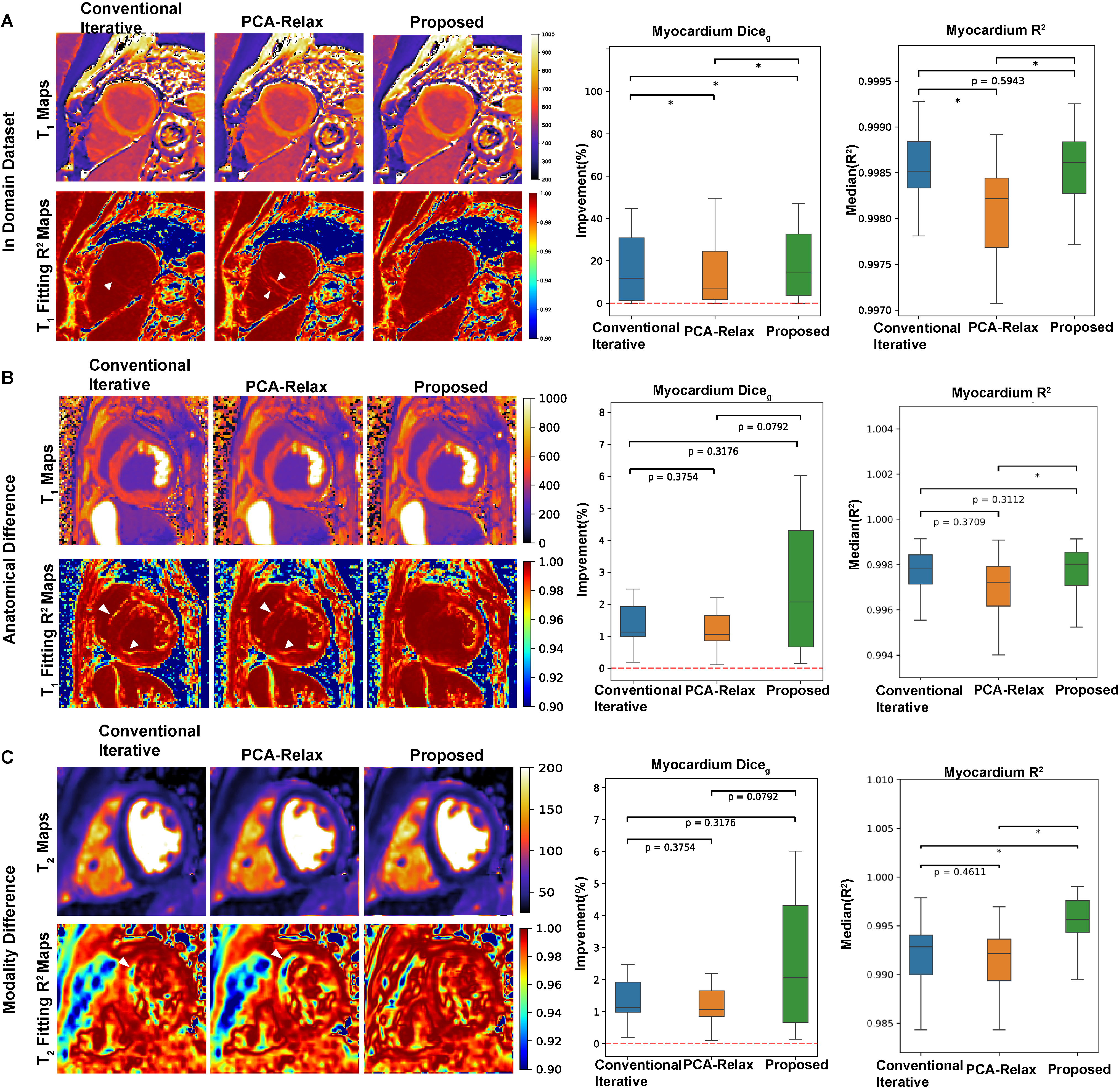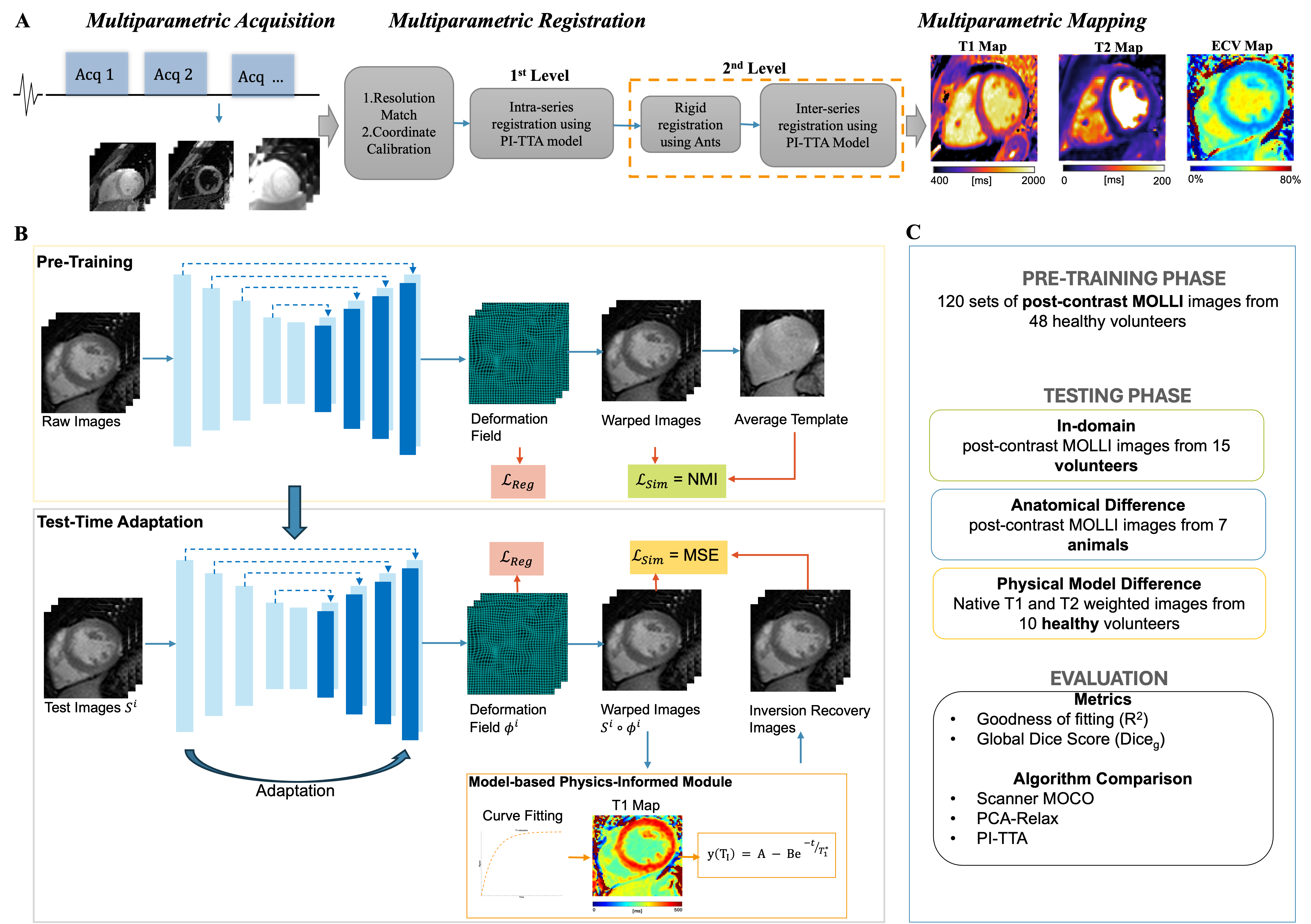 Figure 2: First-level intra-series registration performance. (A) The registration results of in-domain T1 MOLLI sequence(Human, post contrast), (B) Anatomical difference (from human to large animal), and (C) Model difference (from T1 to T2 Relaxation). The representative images and boxplot demonstrated the improvement of using our proposed method comparing to others in both global dice score and fitting performance in all three cases.