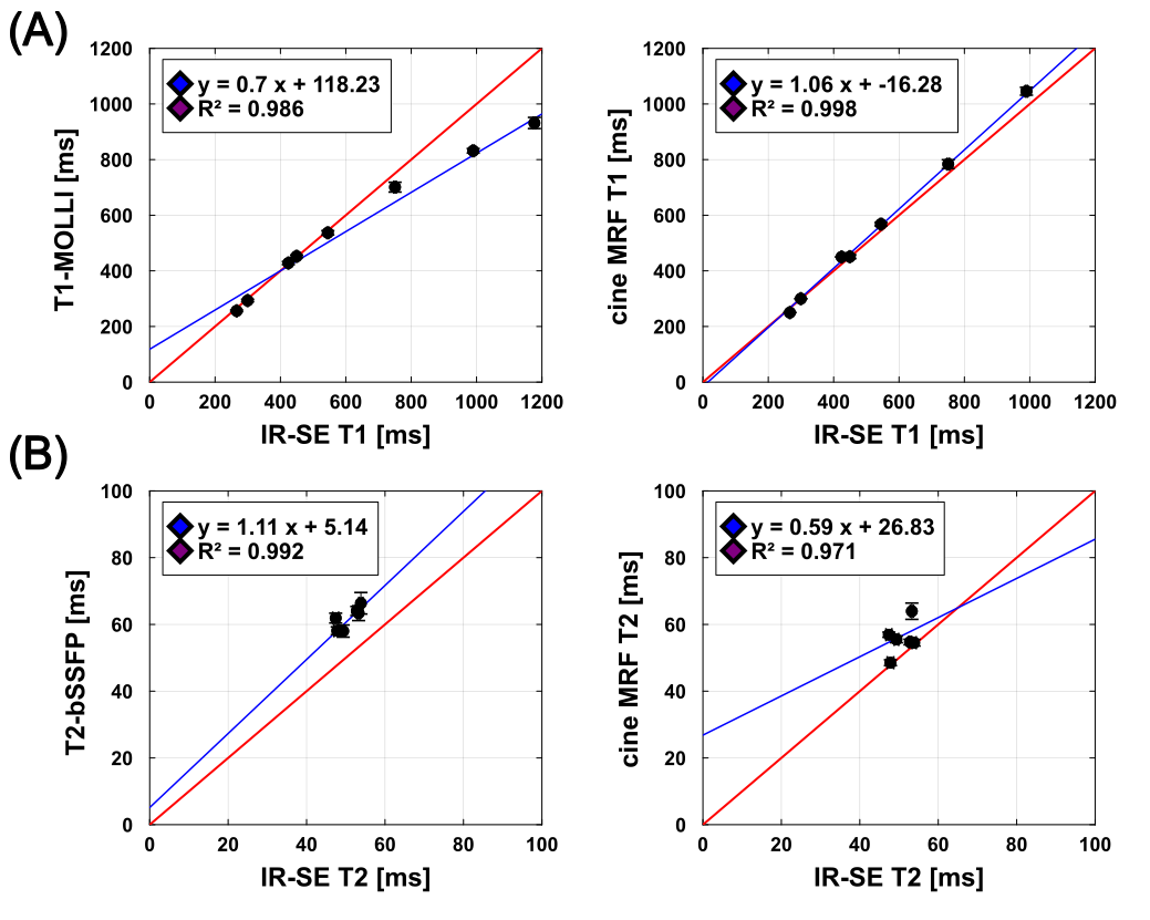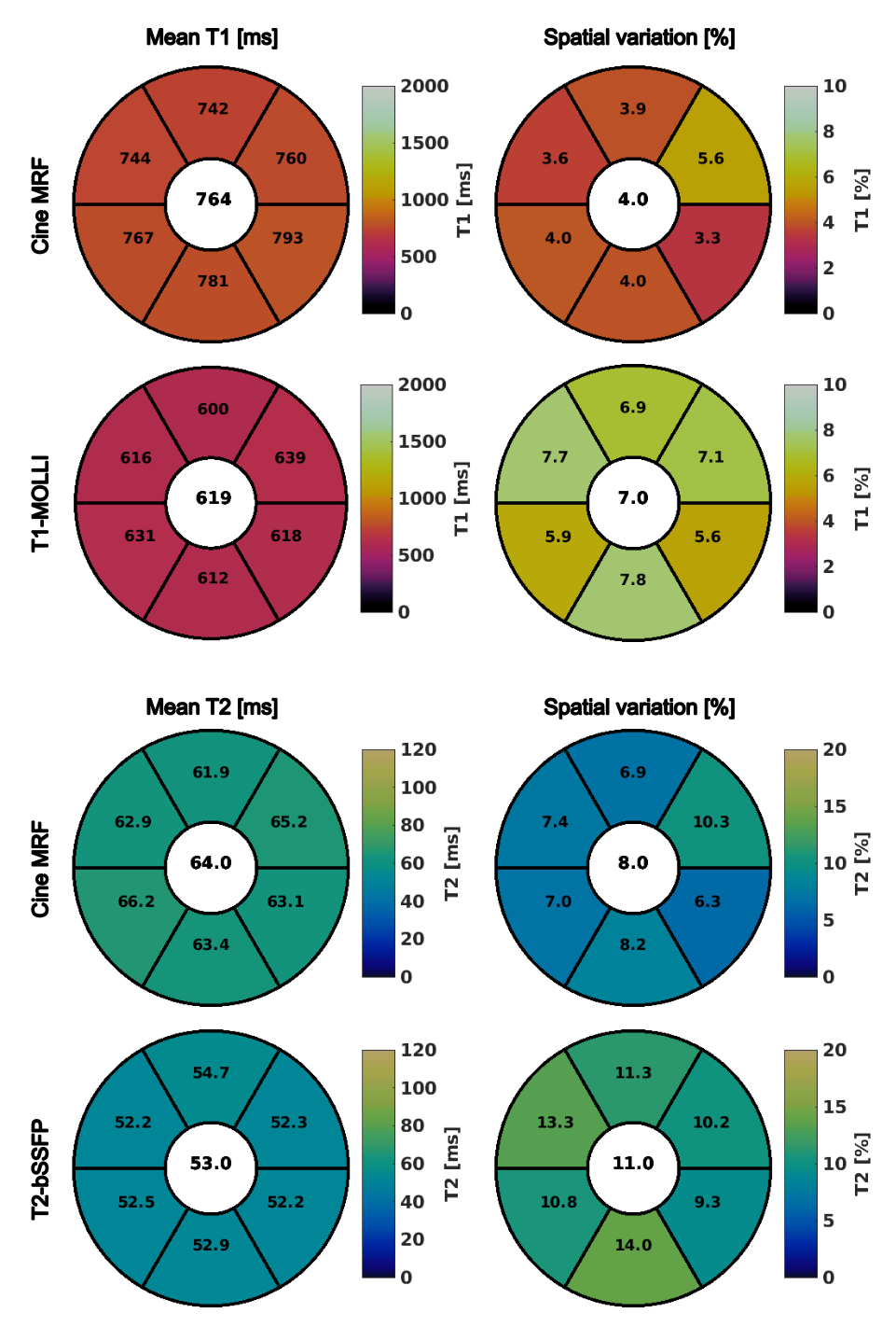 Figure 2. In-vivo regional assessment of the proposed FR-cMRF approach against conventional maps. Average mean/spatial variability values for T1-MOLLI and T2-bSSFP maps are 619±43 ms and 53±5.8 ms, respectively. The mean/spatial variability T1 and T2 values for the proposed FR-cMRF sequence are 764±31 ms and 64±5 ms, respectively, showing higher quantification precision for both relaxation parameters.