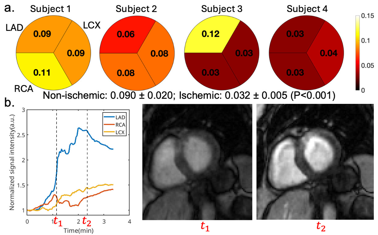 Fig.2. a) Upslope values in 4 subjects. b) The normalized signal intensity-time dynamics and images at two example time points of subject 3. Both RCA and LCX coronary territories are ischemic based on PET reference.