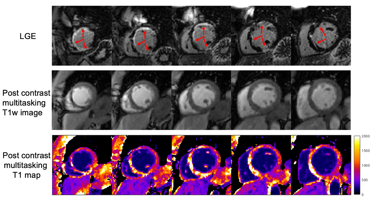 Fig.3. LGE, postcontrast multitasking T1w images and T1 maps of a patient with myocardial scar.