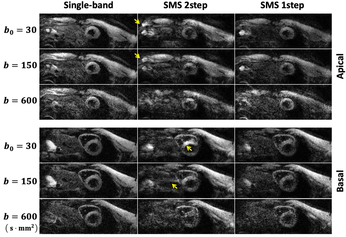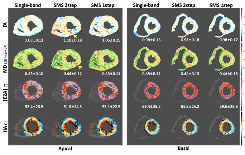 Figure 3. Statistical comparison across 20 volunteers. Violin plots show distributions of MD, FA, HA, and |E2A| for SB, two-step SMS, and one-step SMS with referenceless ghost correction. Significant differences (p < 0.05) are annotated. Metrics were broadly similar across methods; no significant differences were observed except for basal |E2A|, which showed a method effect (pairwise p = 0.017 and p = 0.008). This however is likely a limitation of SB, as apical and basal slices needed to be acquired separately, which due to variations in heart rate likely led to different timepoints in the cardiac cycle and therefore significantly different E2A values (p0.0007). The SMS datasets appears more consistent, and no significant differences are observed between 2-step and 1-step apical and basal slices (p2step=0.27, p1step=0.17).