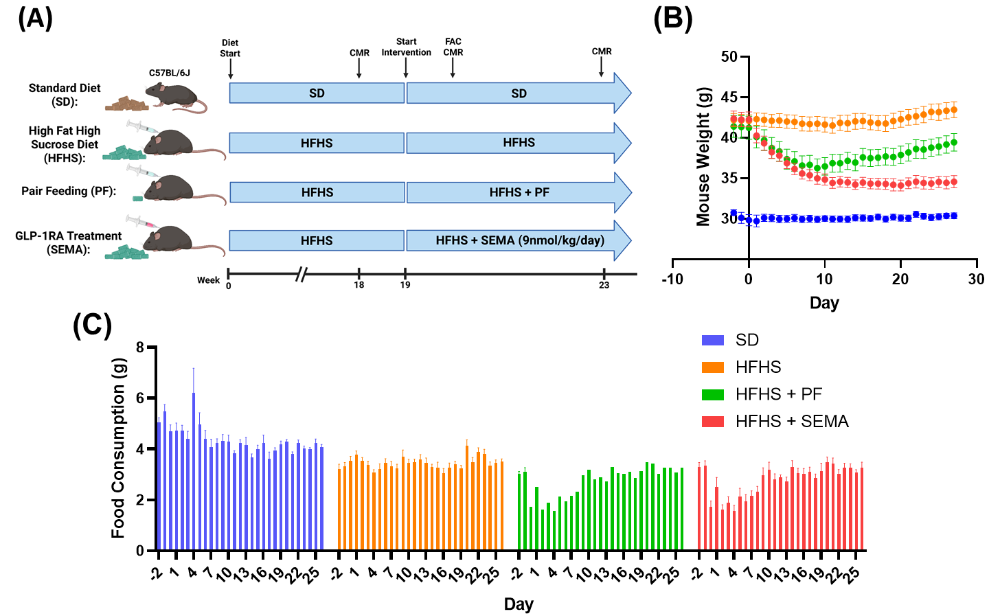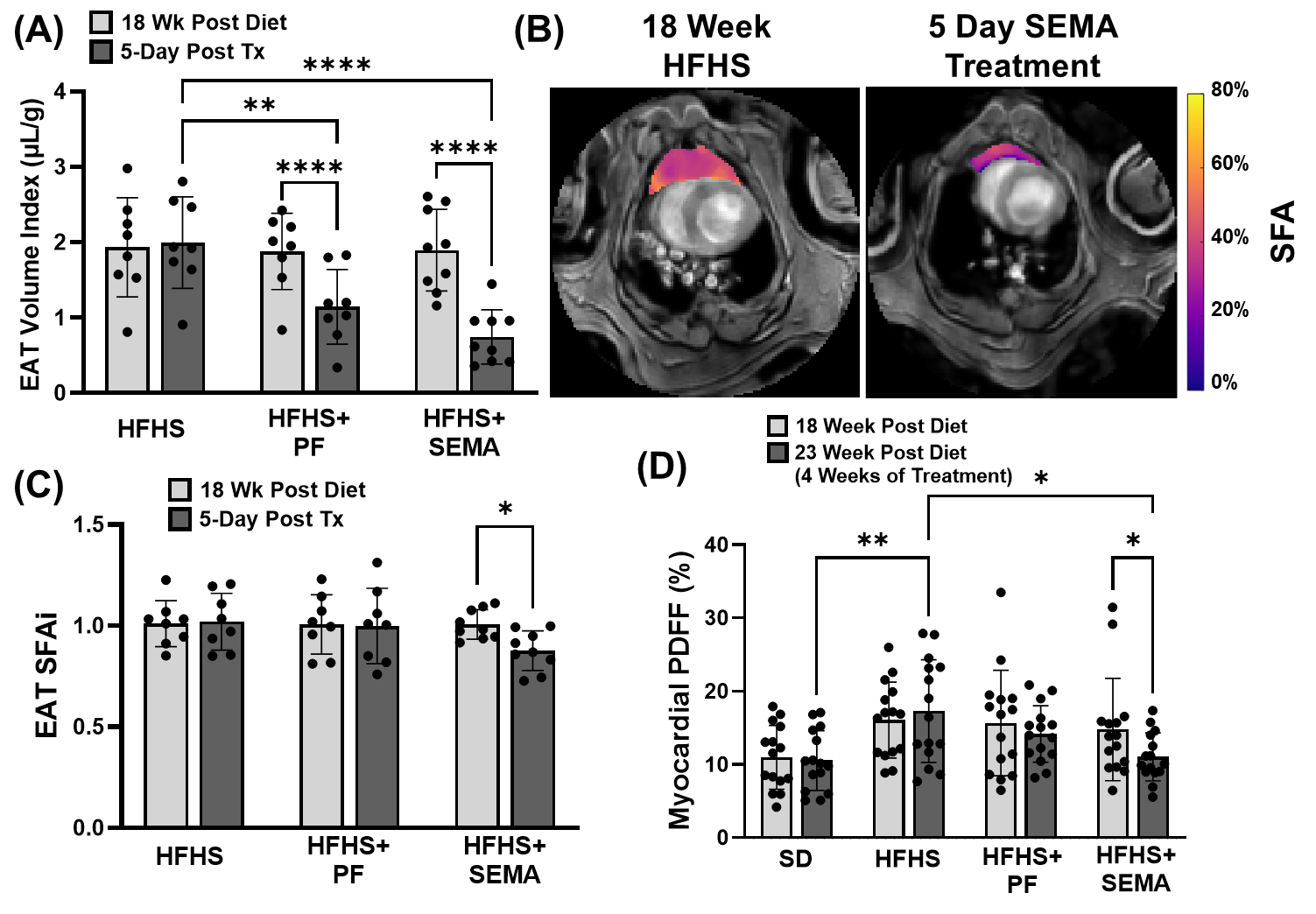 Figure 2: A) EAT volume normalized to body weight before and after 5 days of treatment. B) Example SFA maps overlaid on regions of EAT in short-axis images from the same animal before and after SEMA treatment. C) EAT SFA index in mice before and after 5 days of treatment. D) Myocardial PDFF before and after 28-day treatment. Statistical analysis was performed using two-way repeated measures ANOVA with Tukey’s post hoc tests. Data are presented as mean ± SD. *p < 0.05, **p < 0.01, ****p < 0.0001. Abbreviations as in text.