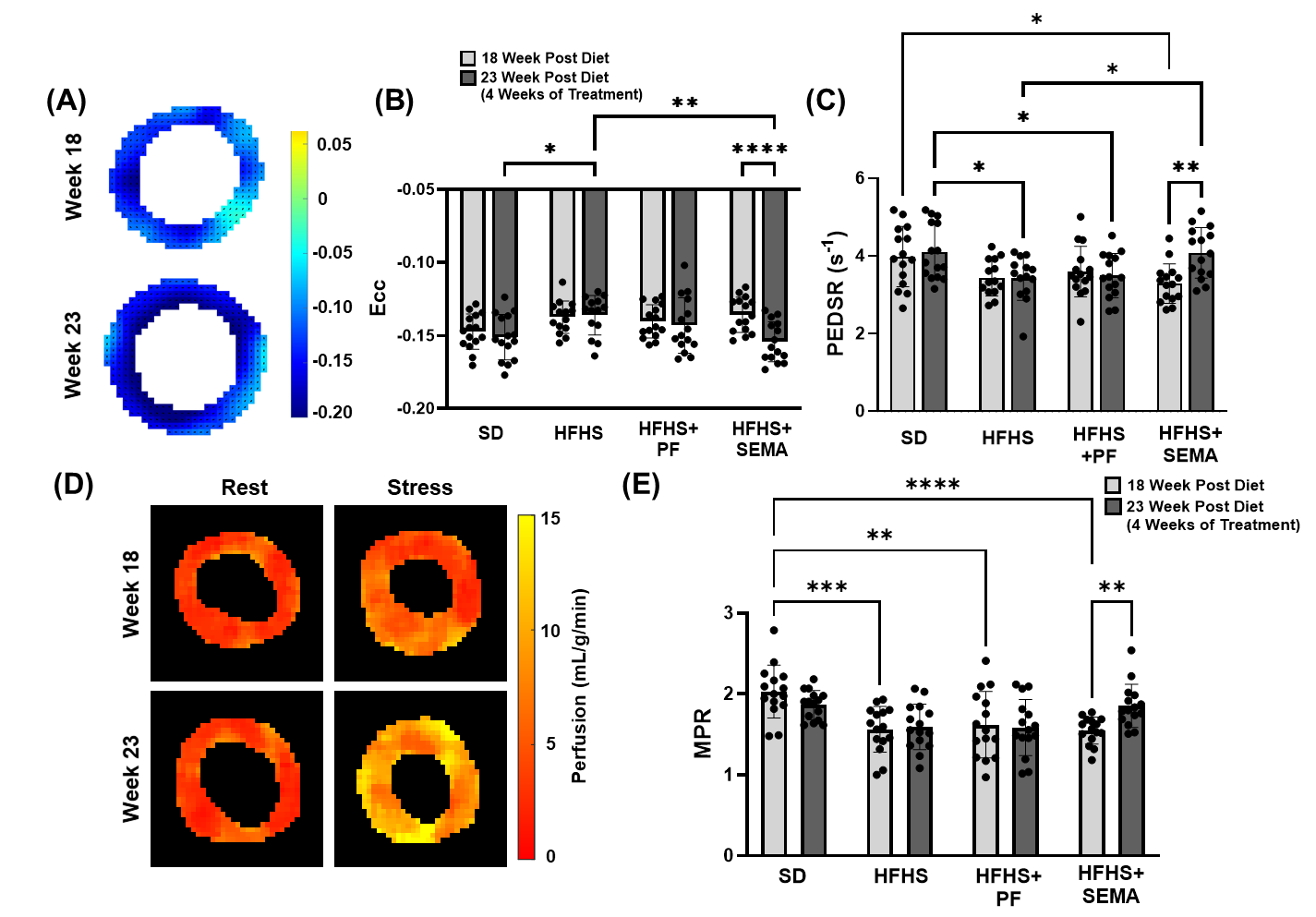 Figure 3: A) Example circumferential strain maps from the same animal before and after SEMA treatment. B) Circumferential strain (Ecc) and C) peak early diastolic strain rate (PEDSR) before and after 28-day SEMA treatment from DENSE imaging. D) Example rest and stress perfusion maps from the same animal before and after SEMA treatment. E) Myocardial perfusion reserve before and after 28-day SEMA treatment. Statistical analysis was performed using two-way repeated measures ANOVA with Tukey’s post hoc tests. Data are presented as mean ± SD. *p < 0.05, **p < 0.01, ***p < 0.001, ****p < 0.0001. Abbreviations as in text.