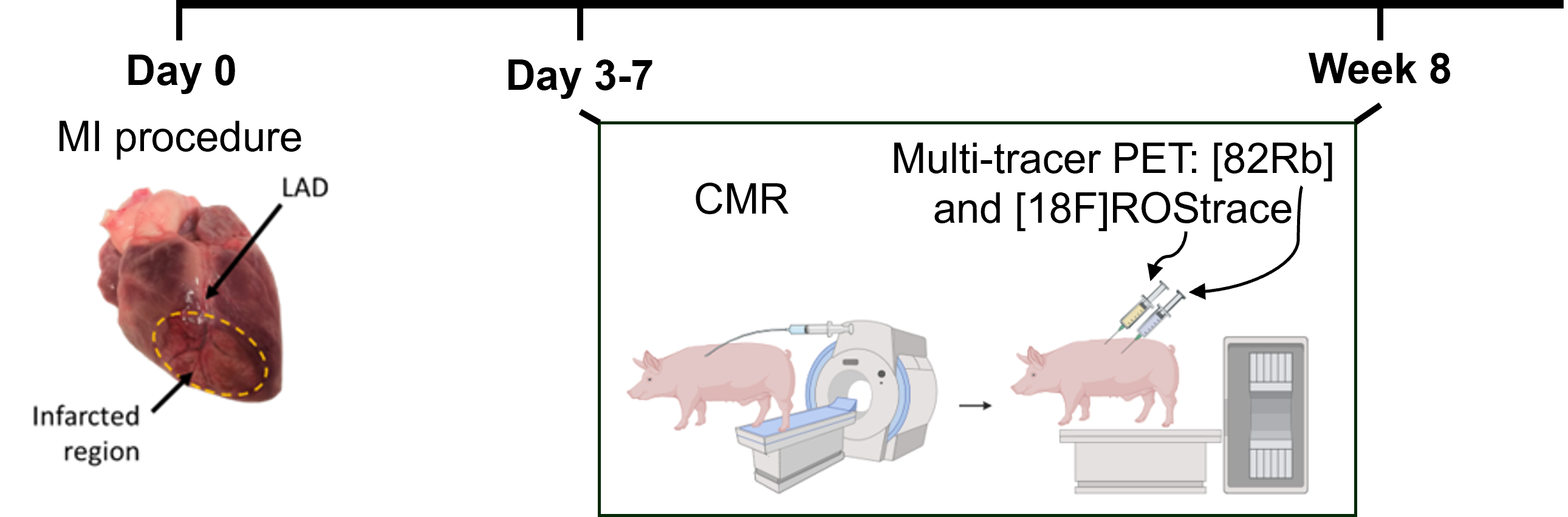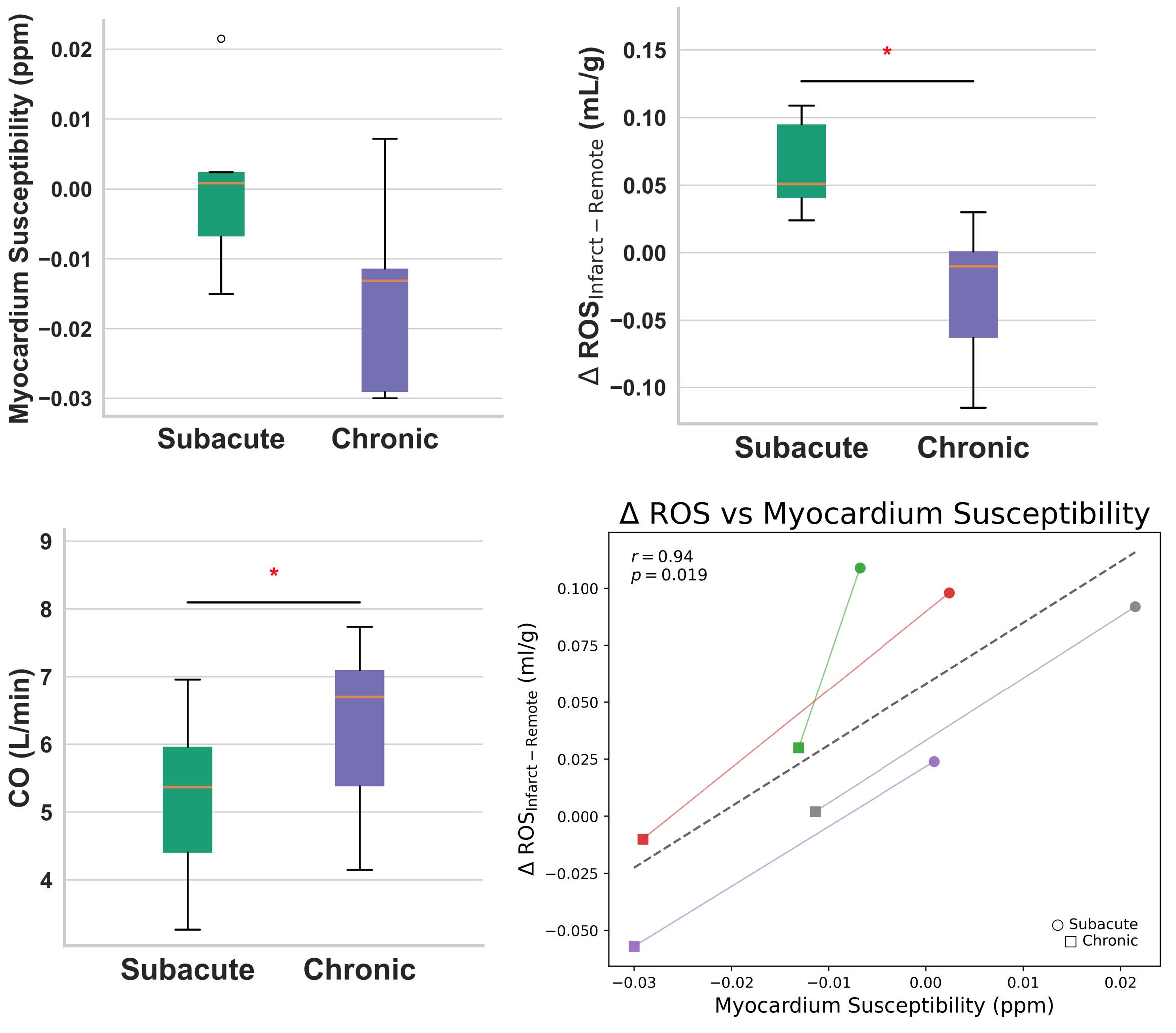 Figure 3: Boxplots of myocardium susceptibility, difference in ROStrace FUR between infarct and remote regions, and cardiac output at the subacute and chronic period. A graph on the relationship between ROS and susceptibility of four swine (had CMR QSM and PET complete).