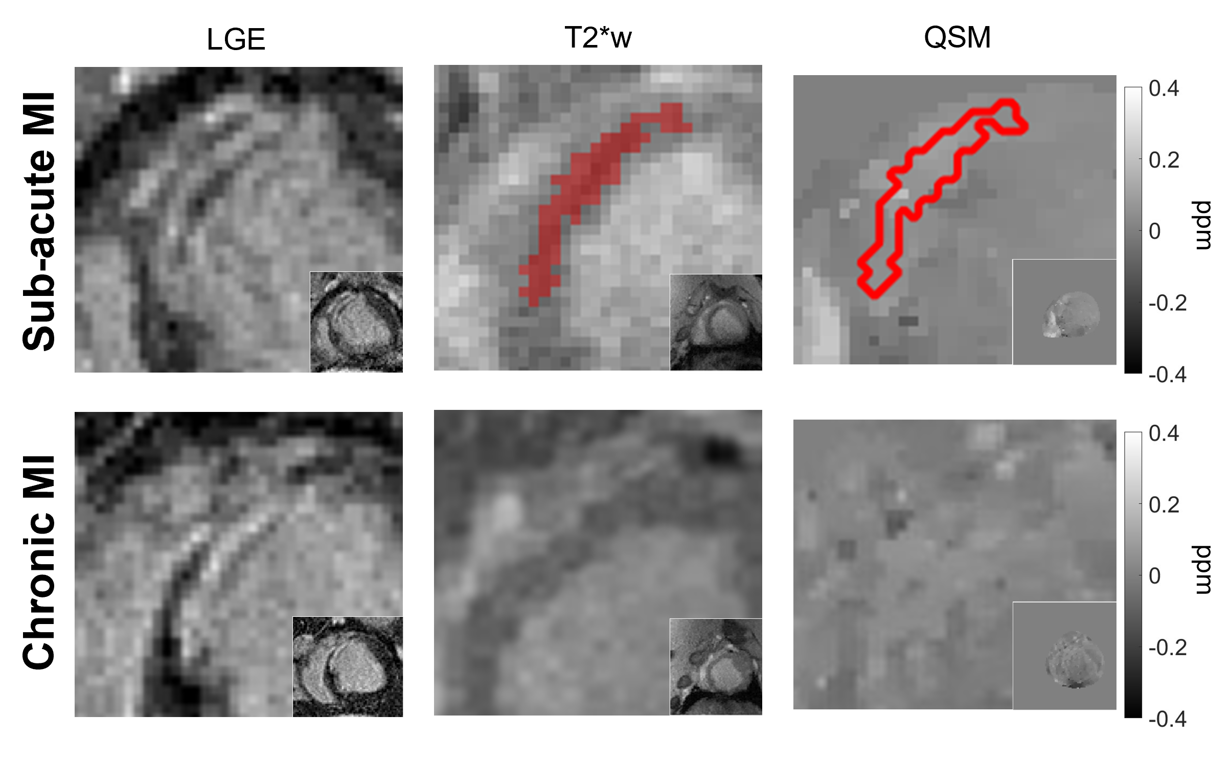 Figure 2: Data analysis. Example of LGE, T2*w, and QSM in a swine imaged at the sub-acute and chronic MI time points.