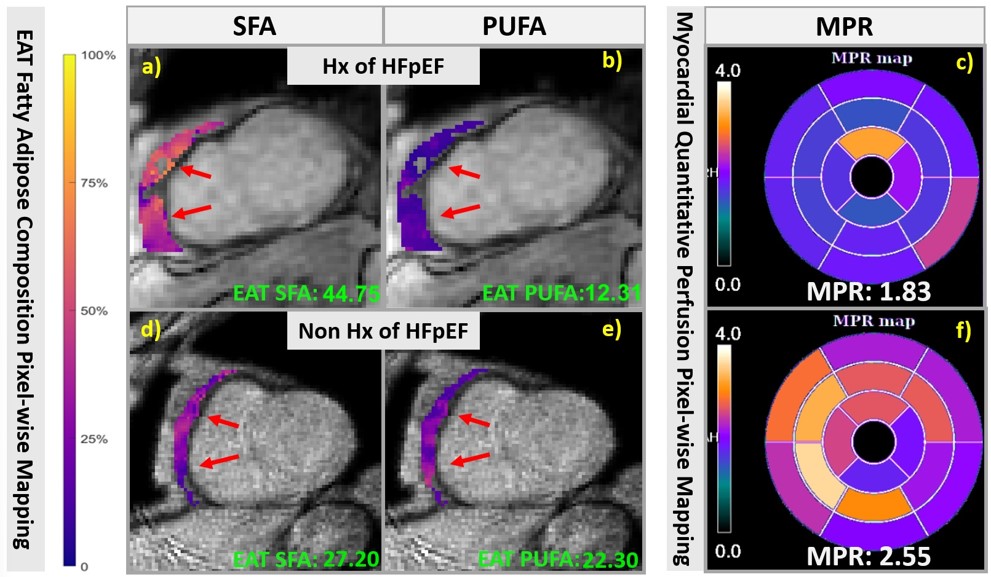 Figure 2. Linear regression plots demonstrating associations between epicardial adipose tissue (EAT) fatty acid composition and cardiovascular magnetic resonance (CMR) parameters. Significantly good correlations observed between EAT SFA fraction and native EAT T1 (a), EAT SFA fraction and myocardial perfusion reserve (MPR) (b), EAT SFA index and MPR (c), and EAT PUFA fraction and MPR (d). No significant correlation was observed between EAT volume index (EATVi) and MPR (e).