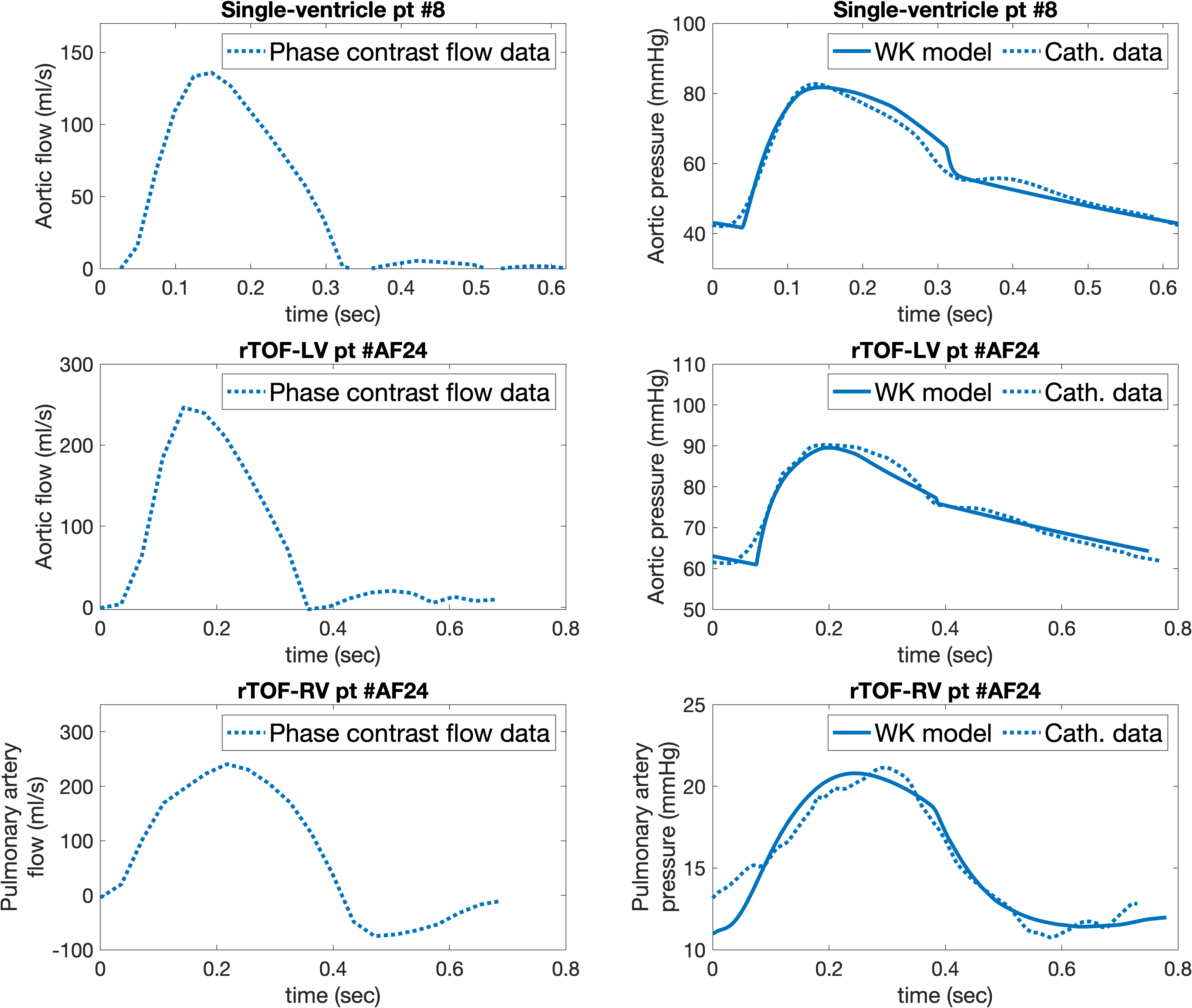 Figure 2. Example of calibrated Windkessel model for a single-ventricle patient, repaired tetralogy of Fallot left ventricle (rTOF-LV), and rTOF right ventricle (RV). Left column demonstrates the phase contrast arterial flow waveforms that were imposed to calibrate corresponding arterial pressure Windkessel (WK) models.