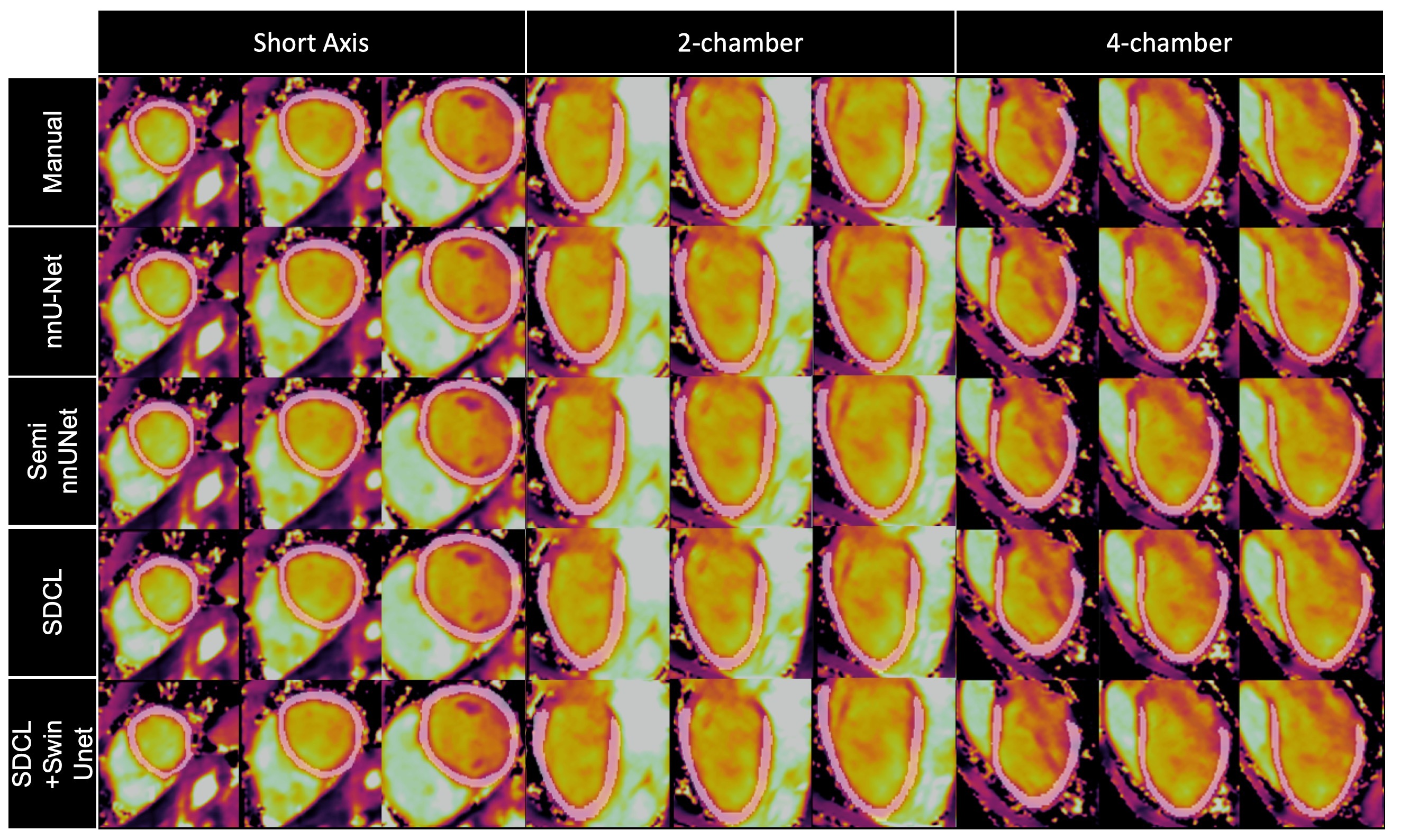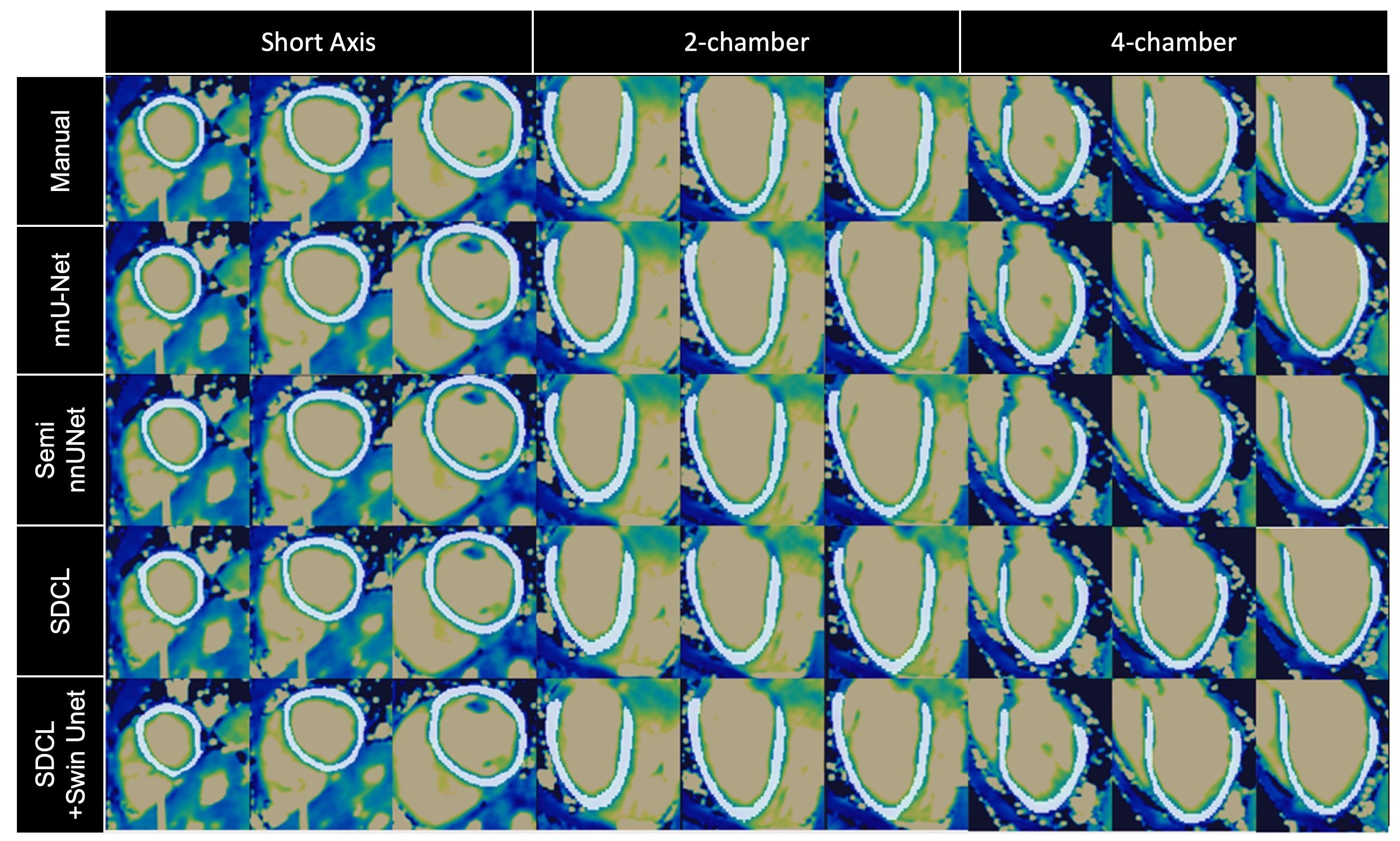 Figure 3: Results for semi-supervised nnUnet and SDCL methods (Nlabeled = 11) in comparison to manual segmentation and supervised nnUnet (Nlabeled = 45) . Representative views are shown for T2 from a healthy subject..jpg)