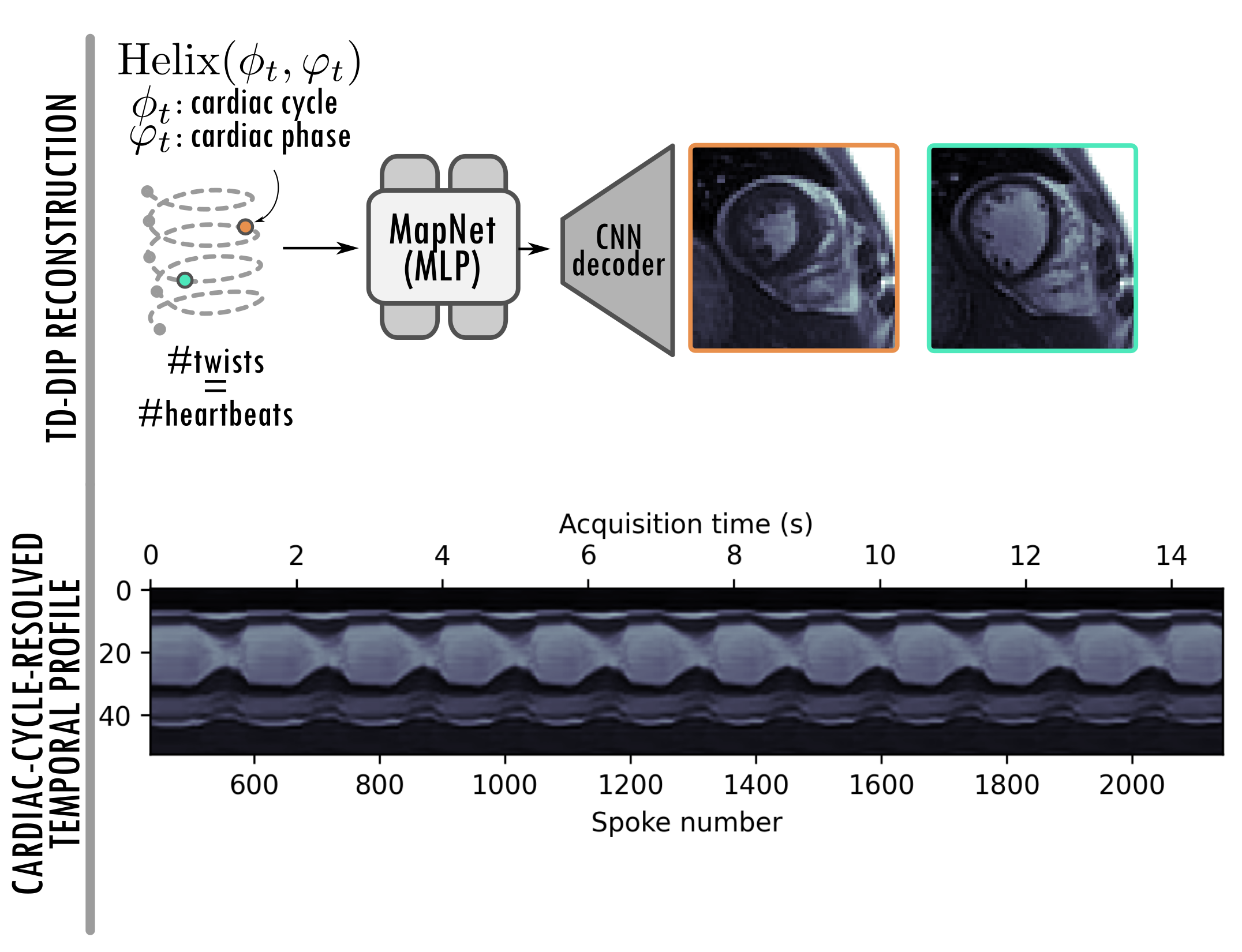 Vertical and horizontal temporal profiles for all subjects. Binned Fully Sampled (FS) reconstruction (30 cardiac phases binned over all cardiac cycles), TR-TD-DIP Fully Sampled, using all the acquired data but TR-resolved, and TR-TD-DIP using just the first two cardiac cycles and TR-resolved. Reconstructions are shown at first cycle. Subjects are sorted from left to right in ascending order of the mean number of spokes per heartbeat (hb), i.e. from most challenging to the easiest.