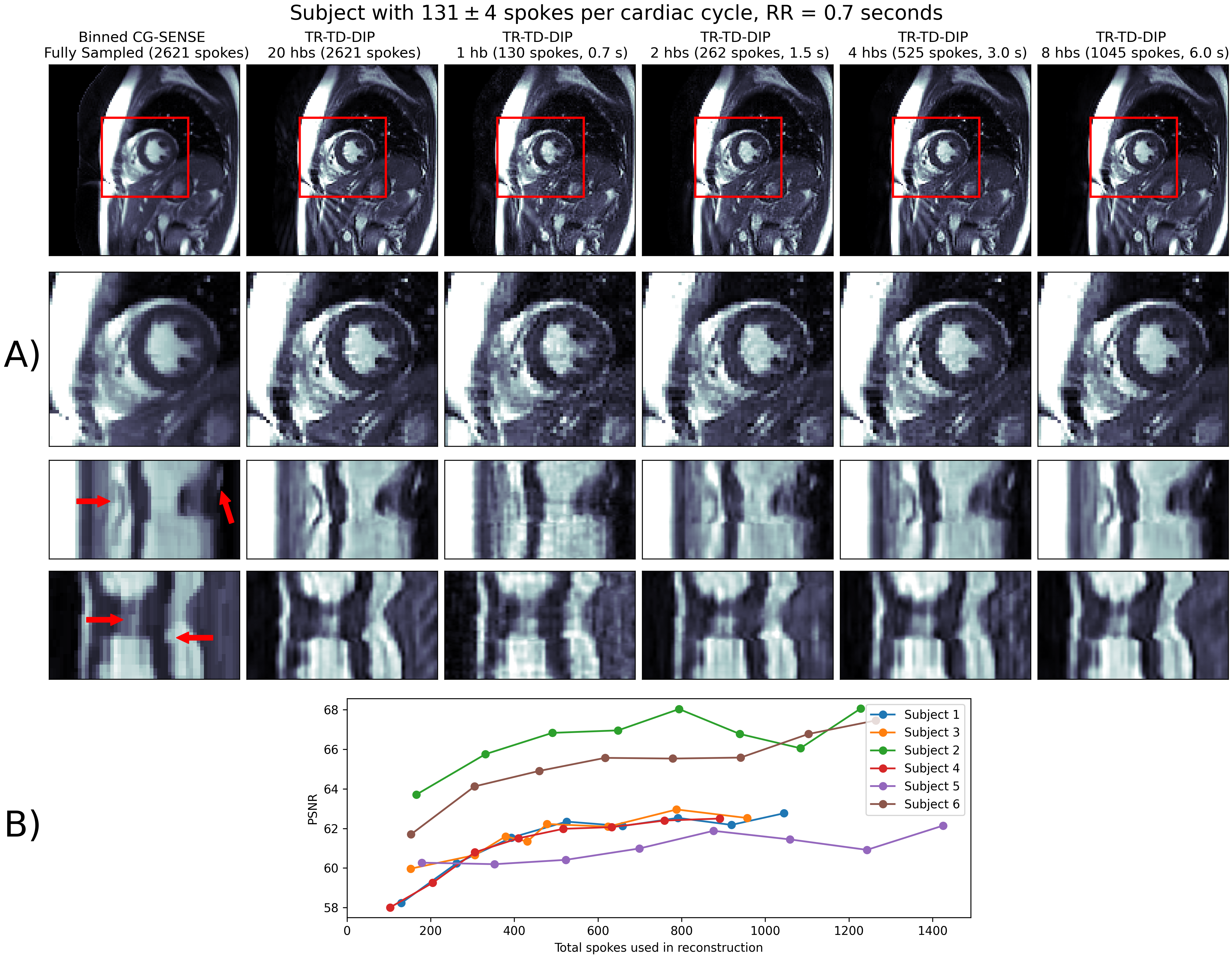 A) Reconstructions for various cardiac cycles for two subjects (fast and medium heart rate) in comparison to fully sampled binned reference (first column). TR-resolved DIP reconstructions are TR-resolved, only the first heartbeat is shown. Red arrows indicate blurriness in the binned reconstruction that appears sharper in the TR-TD-DIP reconstruction B) PSNR for TR-TD-DIP for all subjects using from 1 to 8 cardiac cycles, calculated at first heartbeat, against TR-TD-DIP reference trained with all cardiac cycles.