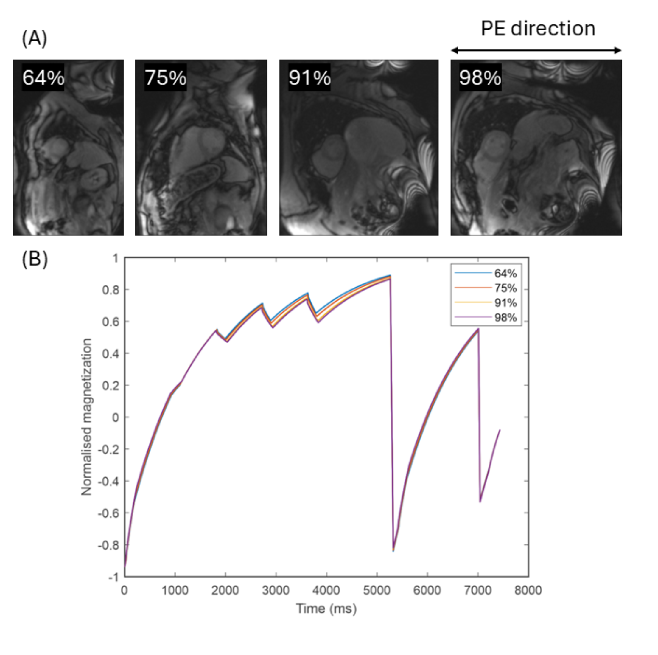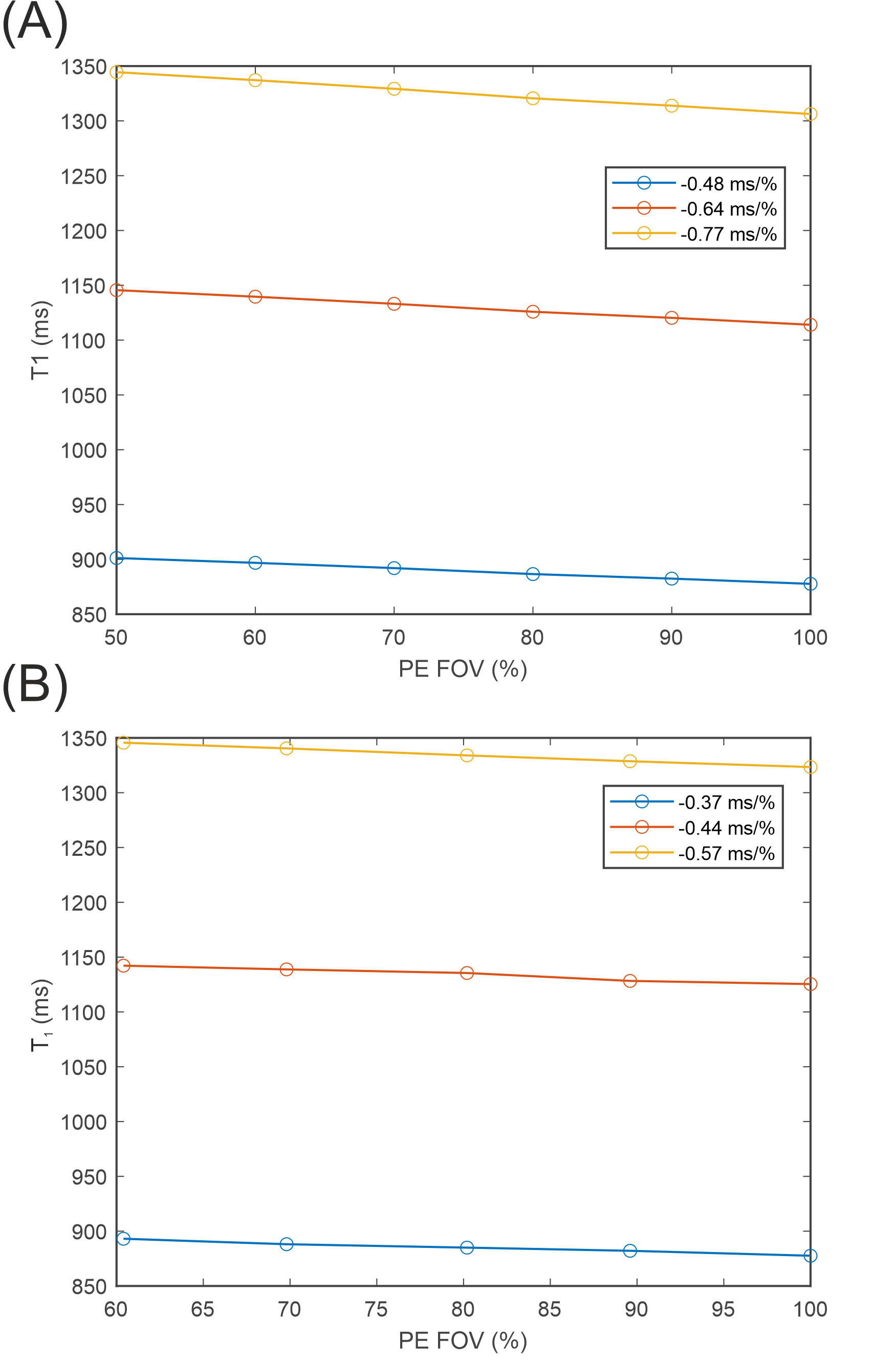Figure 2A: Plot of T1 against % PE FOV for each of the three simulated T1MES tubes. Figure 2B: Plot of T1 against % PE FOV for each of the three native T1MES tubes measured with the UKB ShMOLLI protocol.