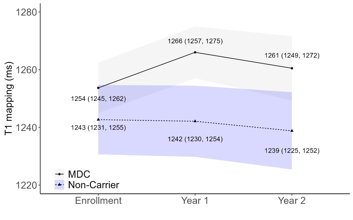 Box-and-whisker plot demonstrating the distribution of native T1 values among female carriers of Duchenne and Becker muscular dystrophy (MDC) and non-carriers at each timepoint. The horizontal black reference line indicates the threshold for an abnormal native T1 value (>1297 ms).