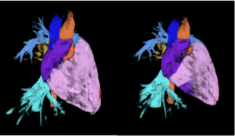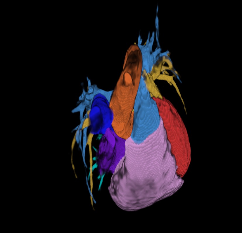 Figure 2: An example of the AI-assisted 3D heart model from a 10-year-old female patient with Tetralogy of Fallot and left pulmonary artery stenosis visualized in VR; AO (Orange), SVC (Royal Blue), IVC (Cyan), LA & PV (Gold), LV (Red), RA (Purple), PA (Light Blue), and RV (Pink).