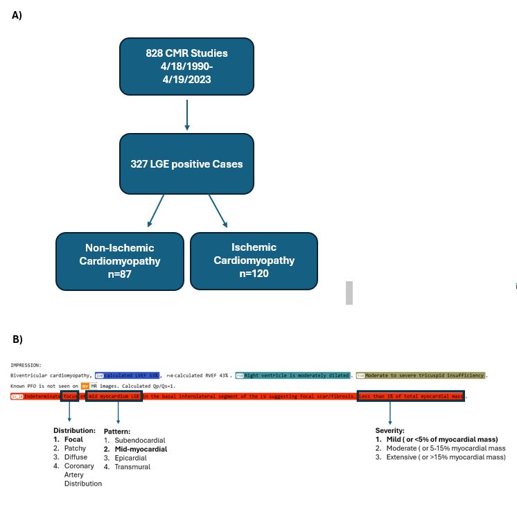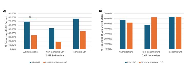 Figure 3: Reporting of LGE A) Pattern and B) Distribution by LGE in ICM and NICM cases with mild and moderate/severe LGE burden. * p < 0.05