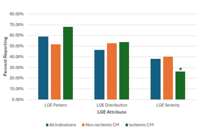 Figure 2: Reporting of LGE location, pattern, and severity in ICM and NICM. * p < 0.05
